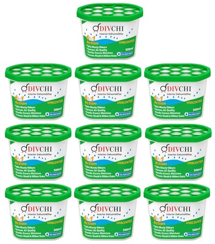 DIVCHI Moisture Absorber Dehumidifier Tubs 500ml (Pack of 10) | Damp Traps for Home, Wardrobe, Bathroom, Caravan & Kitchen | Condensation & Mould Remover