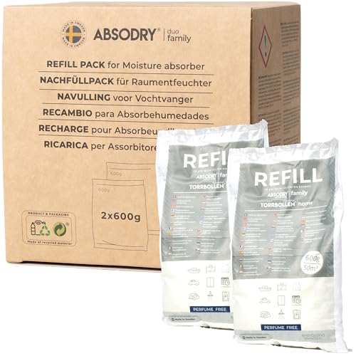 ABSODRY duo family Moisture Absorber Refill Bags 2 x 60 m3 for Hanger and Bag Small Dehumidifier for Bedroom Bathroom RV Closet Air Cleaner Odor Eliminator Moisture Bags Up to 90 Days 2x165 SqFt 2Pk