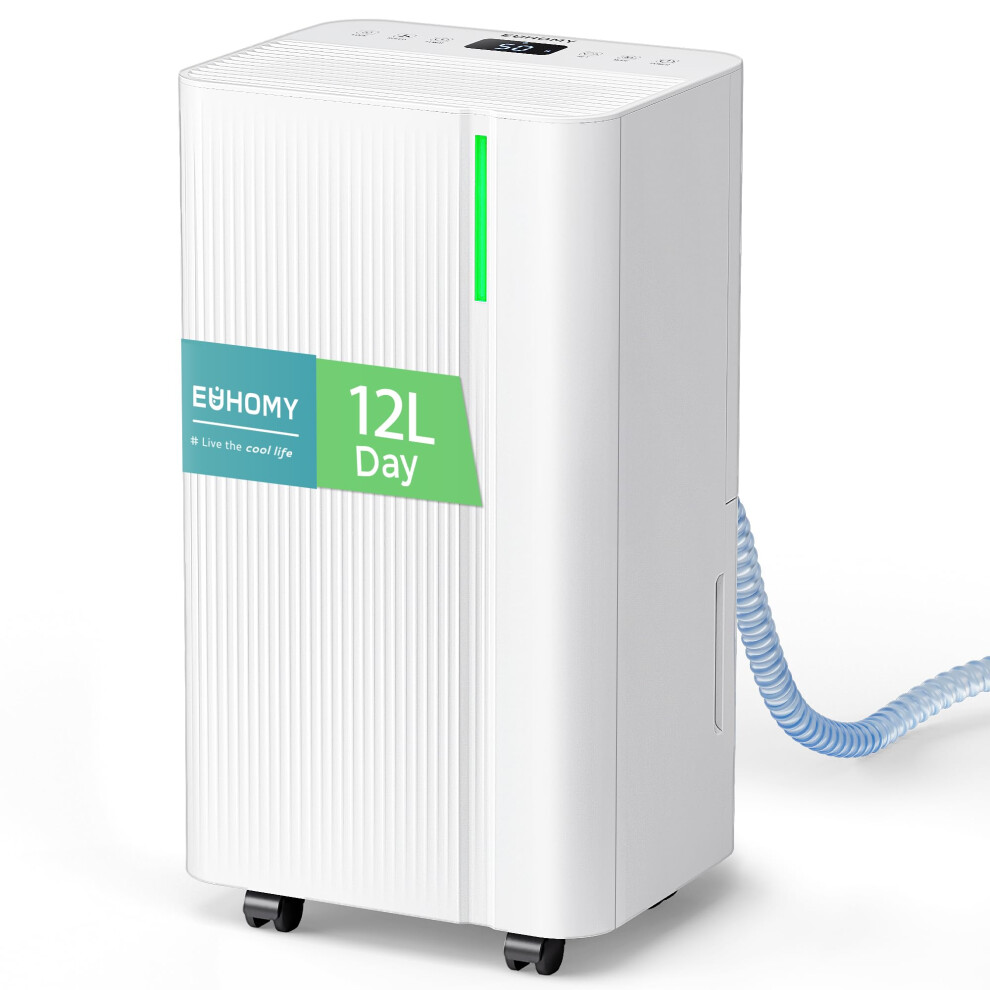 EUHOMY 12L/Day Dehumidifiers for Home, Smart Electric Dehumidifier for Drying Clothes, Low Energy & Ultra-quiet, with Auto-Defrost & Humidity Sensor, 24-Timer, Continuous Drain