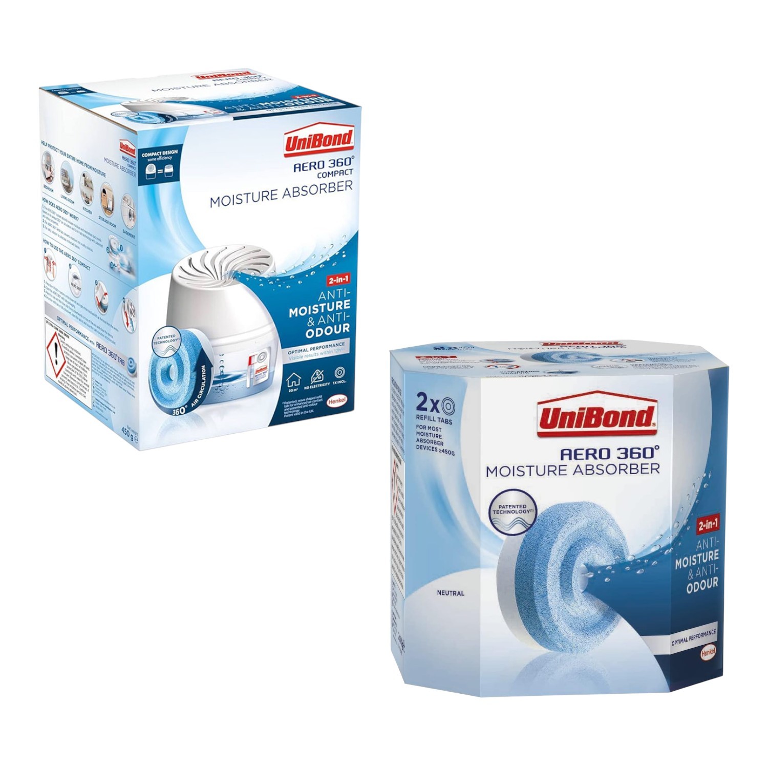 UniBond AERO 360º Moisture Absorber, Ultra-Absorbent Dehumidifier, Helps to Prevent Condensation & AERO 360° Moisture Absorber Neutral Refill Tab, Twin Pack (2 x 450g)