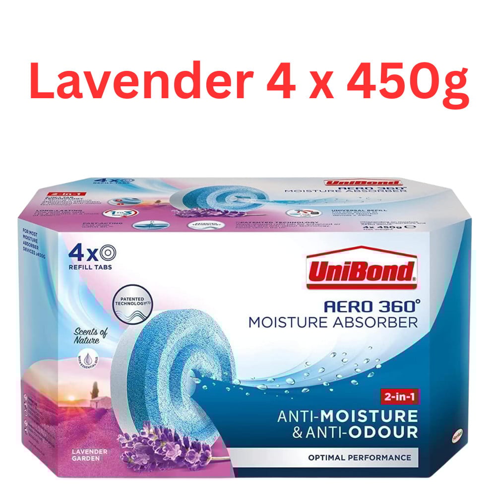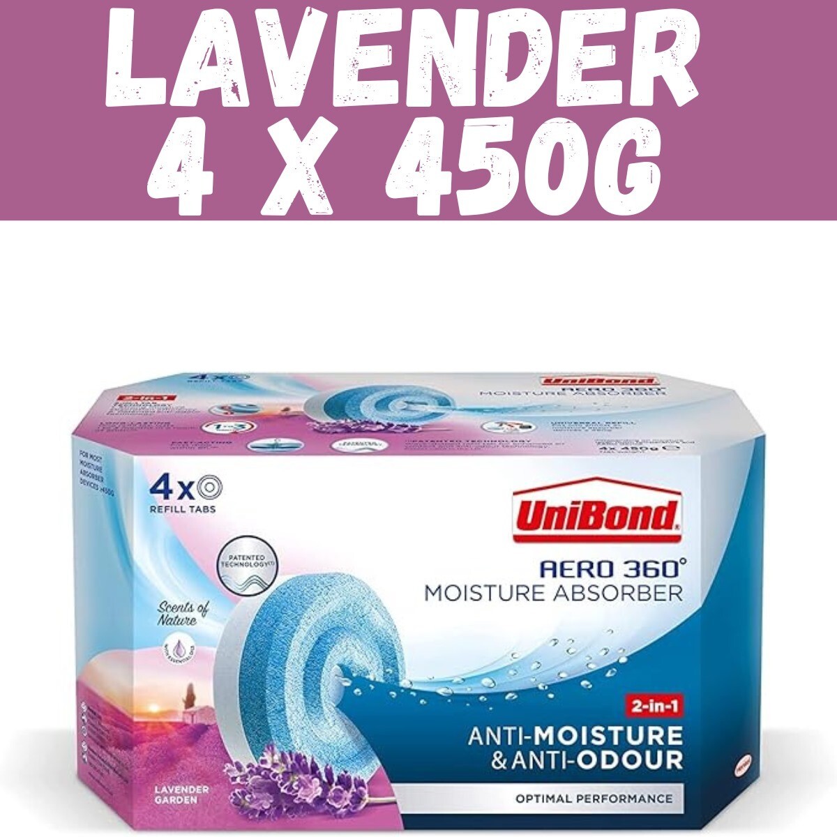 UniBond AERO 360° Moisture Absorber Lavender Garden Refill Tab, aromatherapy, ultra-absorbent and odour-neutralising, (4 x 450g), UniBond AERO 360º Moisture Absorber, Ultra-Absorbent Dehumidifier