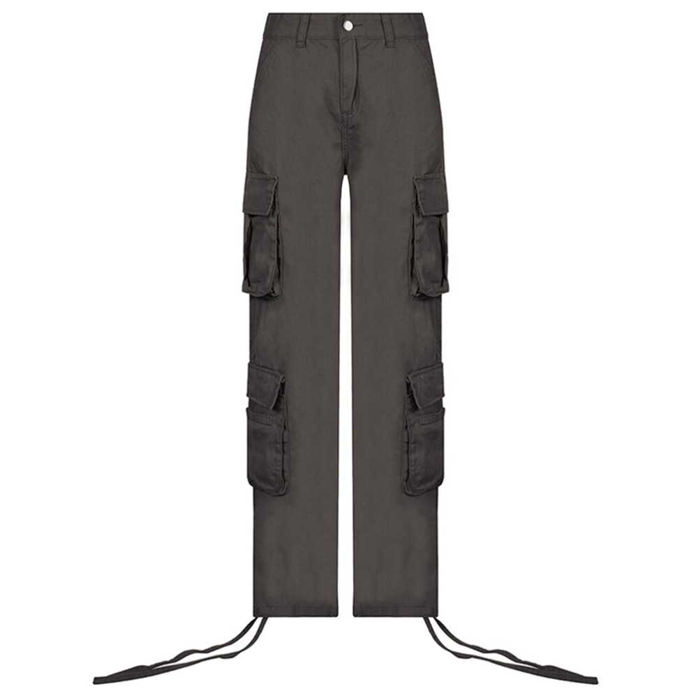 (Grey Beige-S) Ruched Big Pockets Cargo Jeans Retro Sporty Low Waisted Trousers Light Brown Streetwear Denim Joggers Women