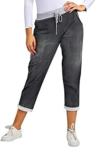 Women’s Ladies Denim Joggers Star Printed Sweatpants Floral Ribbed Waistband Trousers Ladies Casual Summer Italian (Charcoal, 20-22)