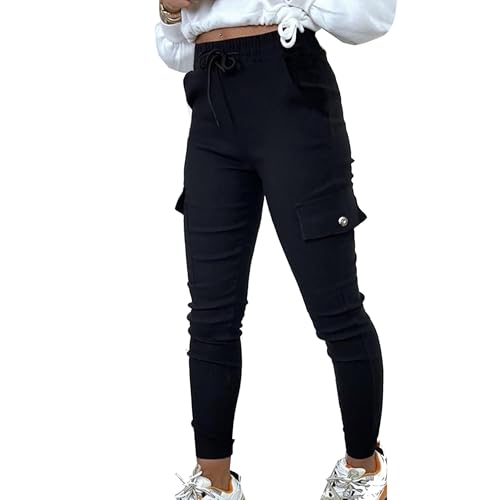 Women's Button Cargo Pocket Jean Denim Look Stretch Fit Combat Trousers Joggers Pants (S-M, Black)