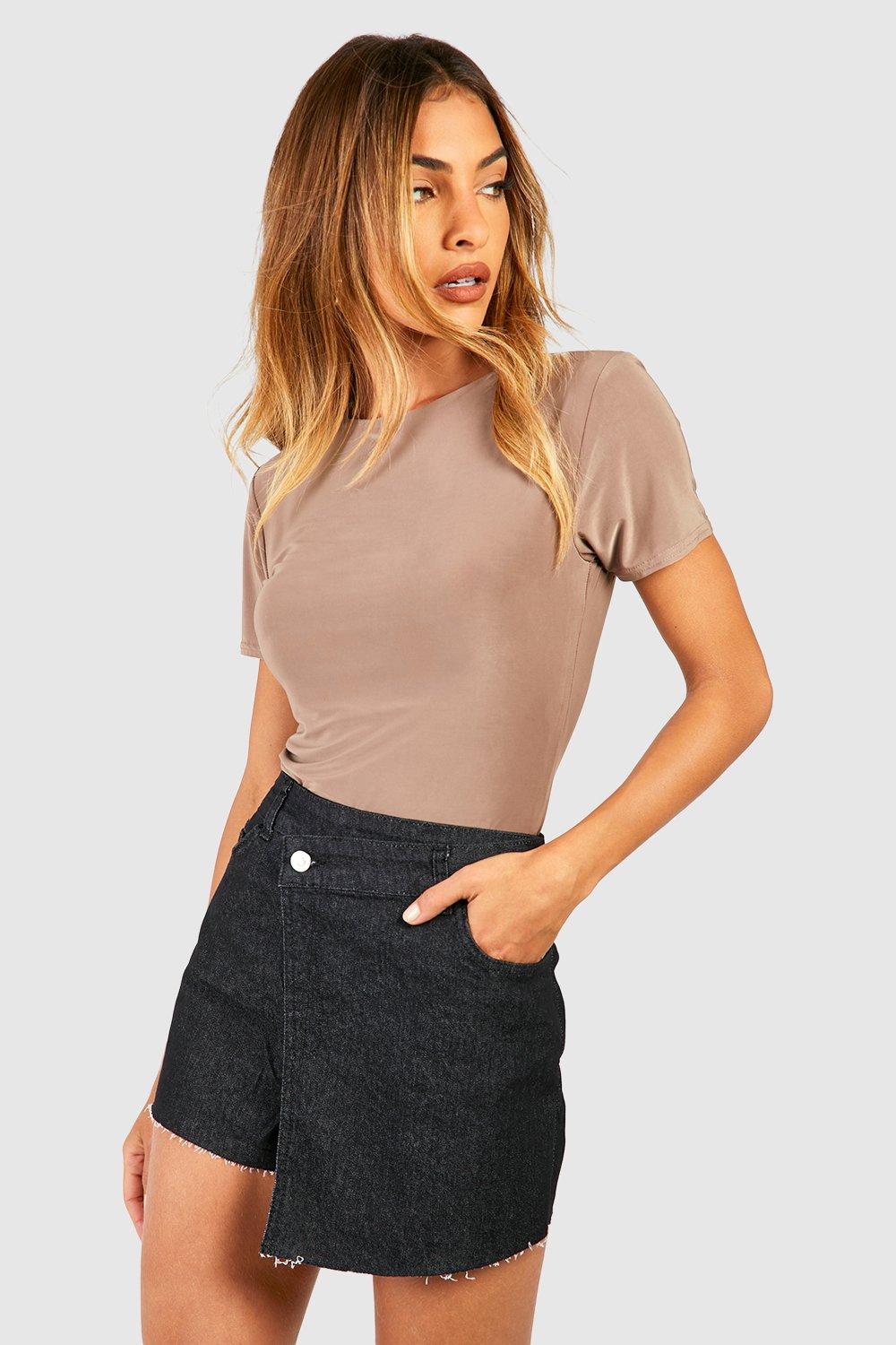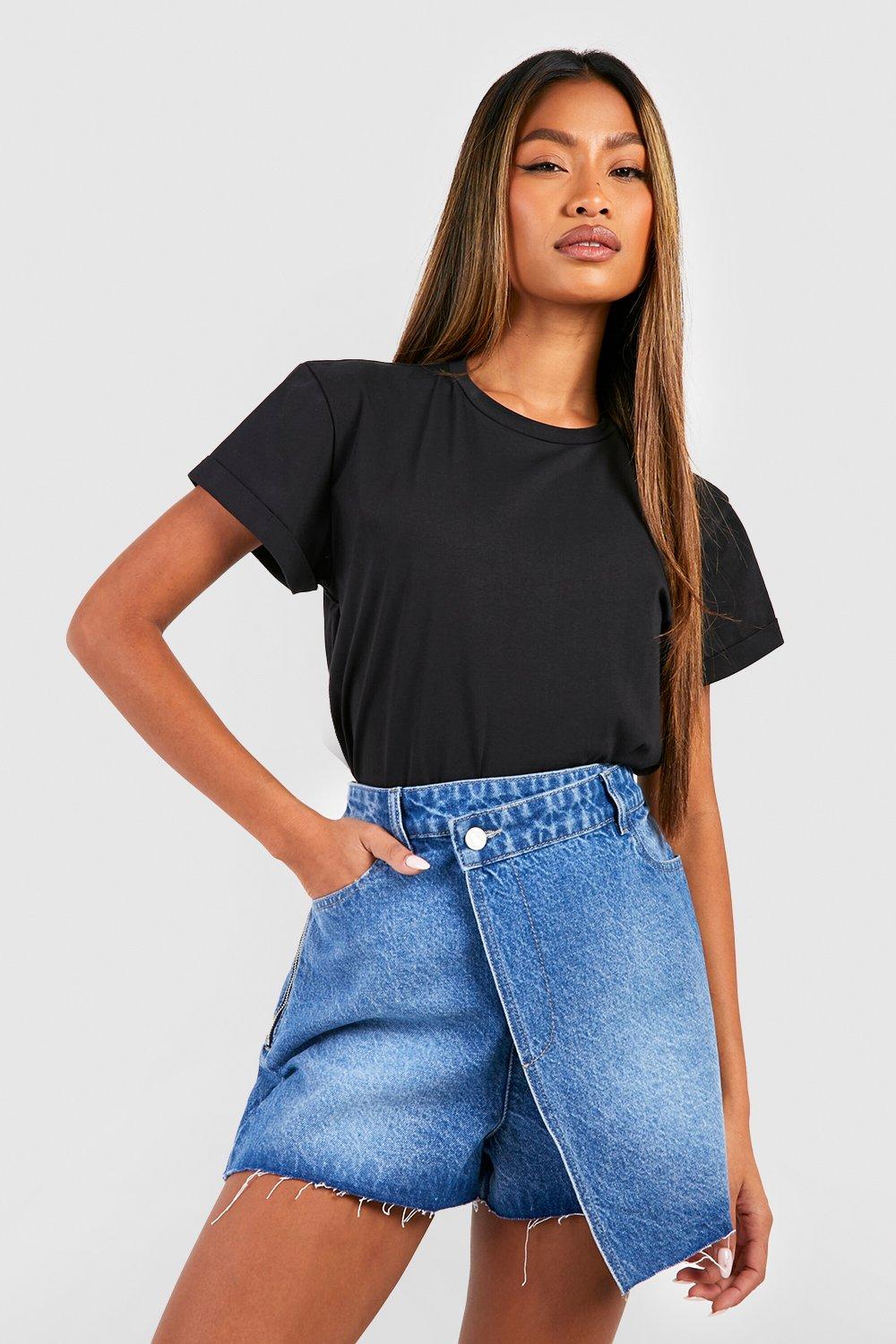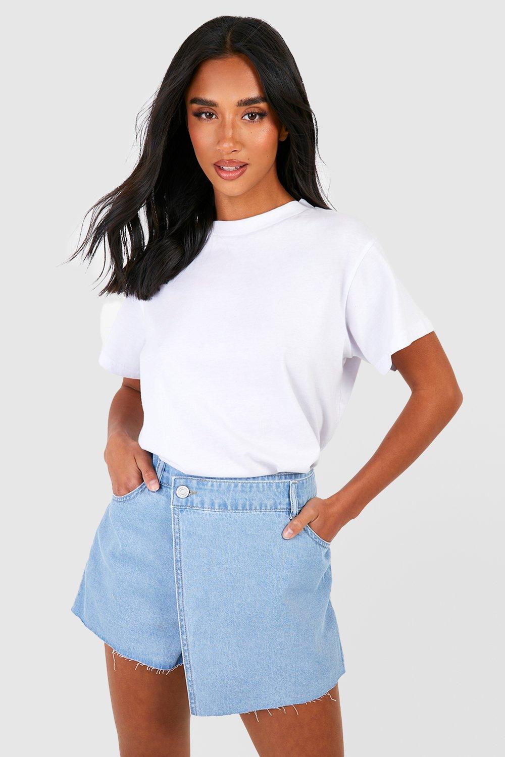 Petite Wrap Waist Raw Hem Denim Skort