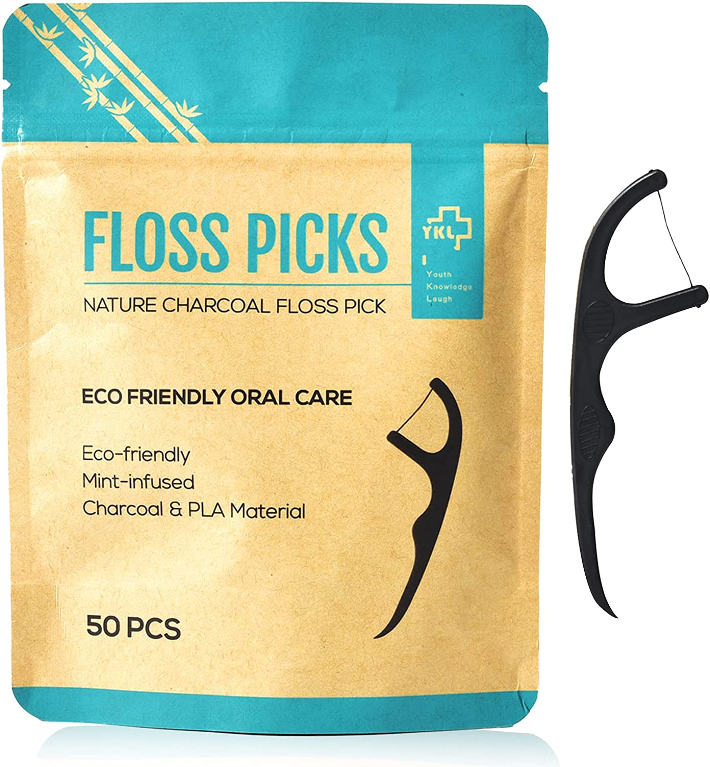 RAZOKO Biodegradable Dental Floss Picks, Charcoal Toothpick Stick Soft On Gum &