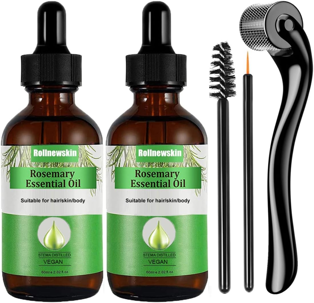 2Pack Rosemary Essential Oil(60ML)+ Derma Roller 0.5mm for Hair, Eyebrow and Ey