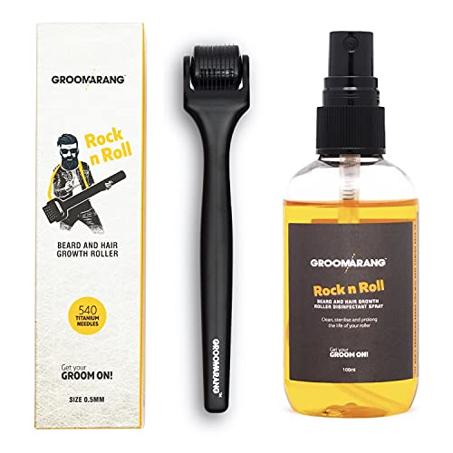 groomarang Beard Roller for Men 0.5mm Derma Roller for Beard Growth with 540 Titanium Needles - Suitable for Use on the Face and Scalp - Includes Storage Case & Disinfectant Spray 100ml