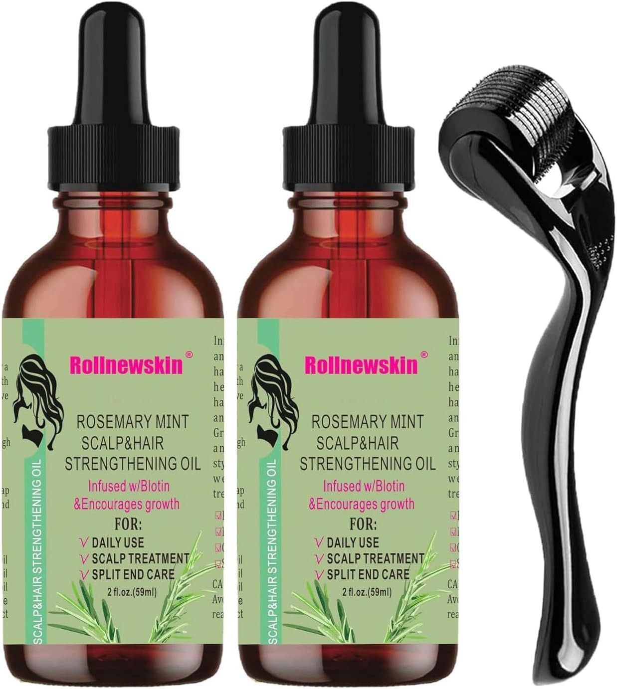 Rosemary Oil (60ML)+ Derma Roller 0.5mm for Hair Growth, Skin Care, Eyebrow and Eyelash Growth for Aromatherapy & Diffuser, Hair Loss Treatment Oil for Women and Men
