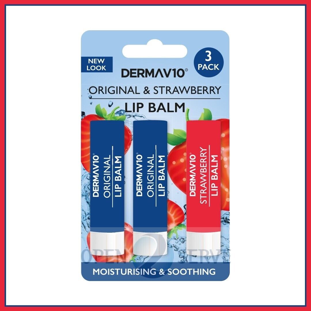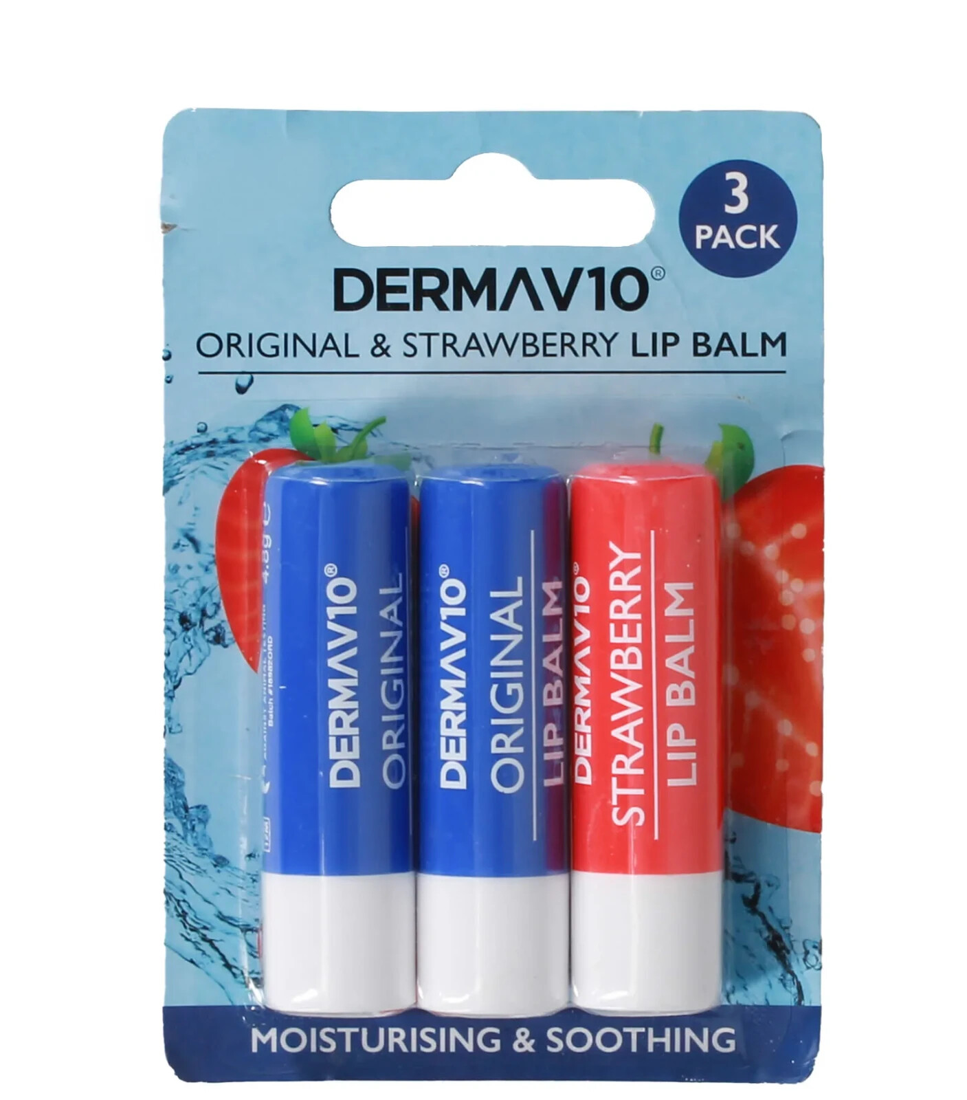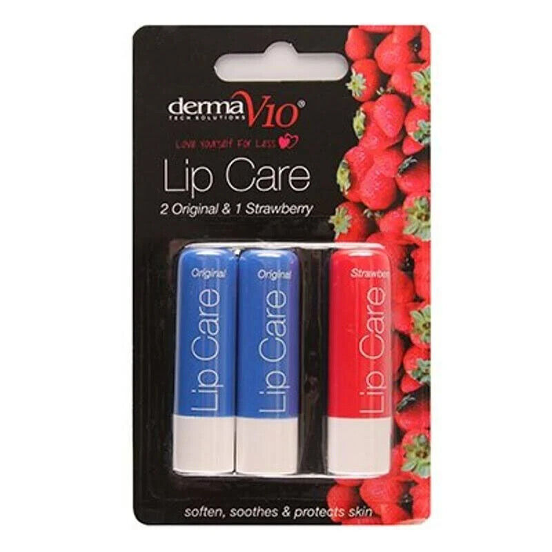 DermaV10 Lip Balm Pack of 3 Original Strawberry Moisturiser Softener
