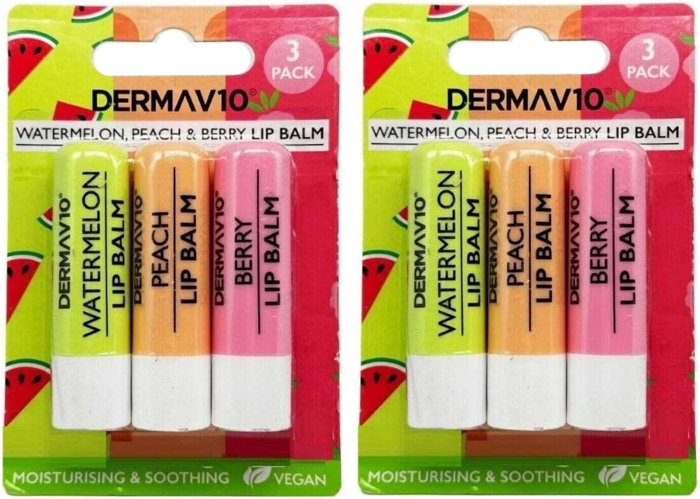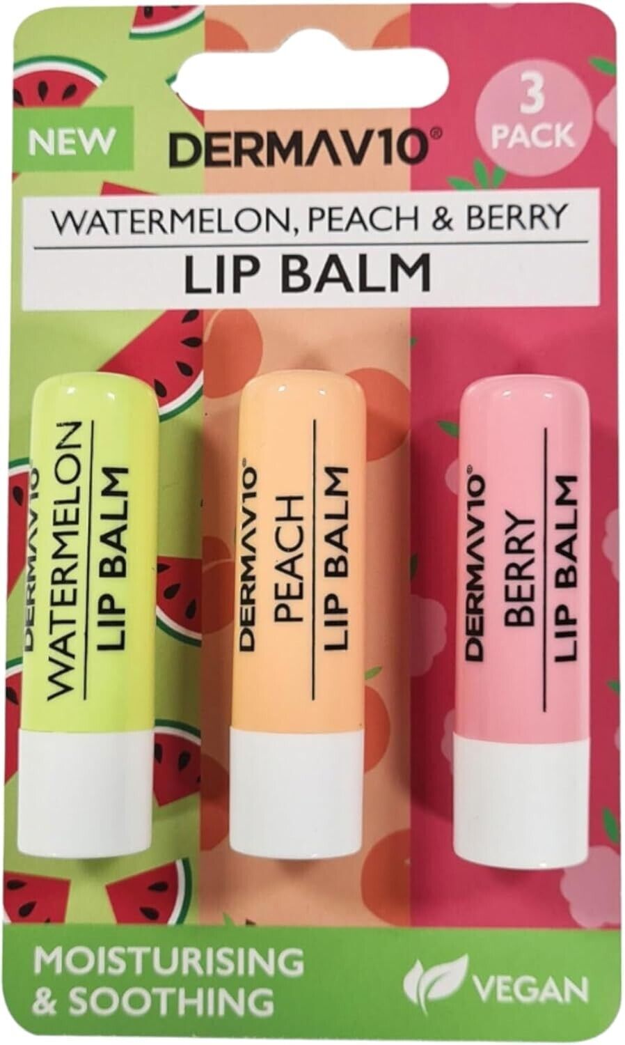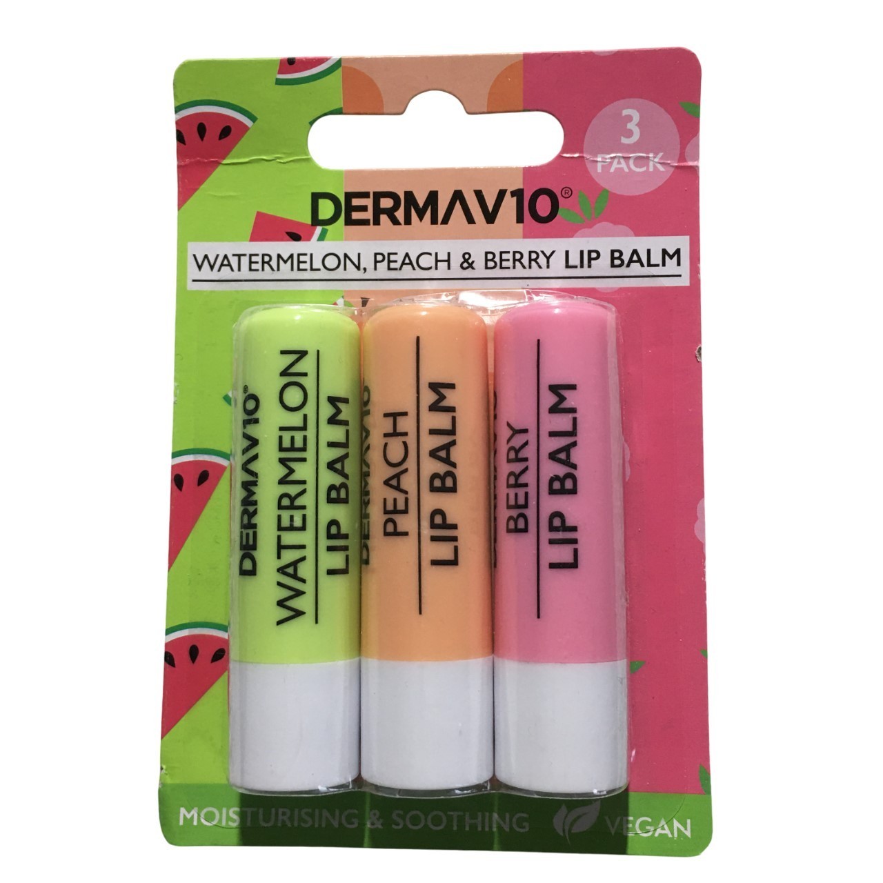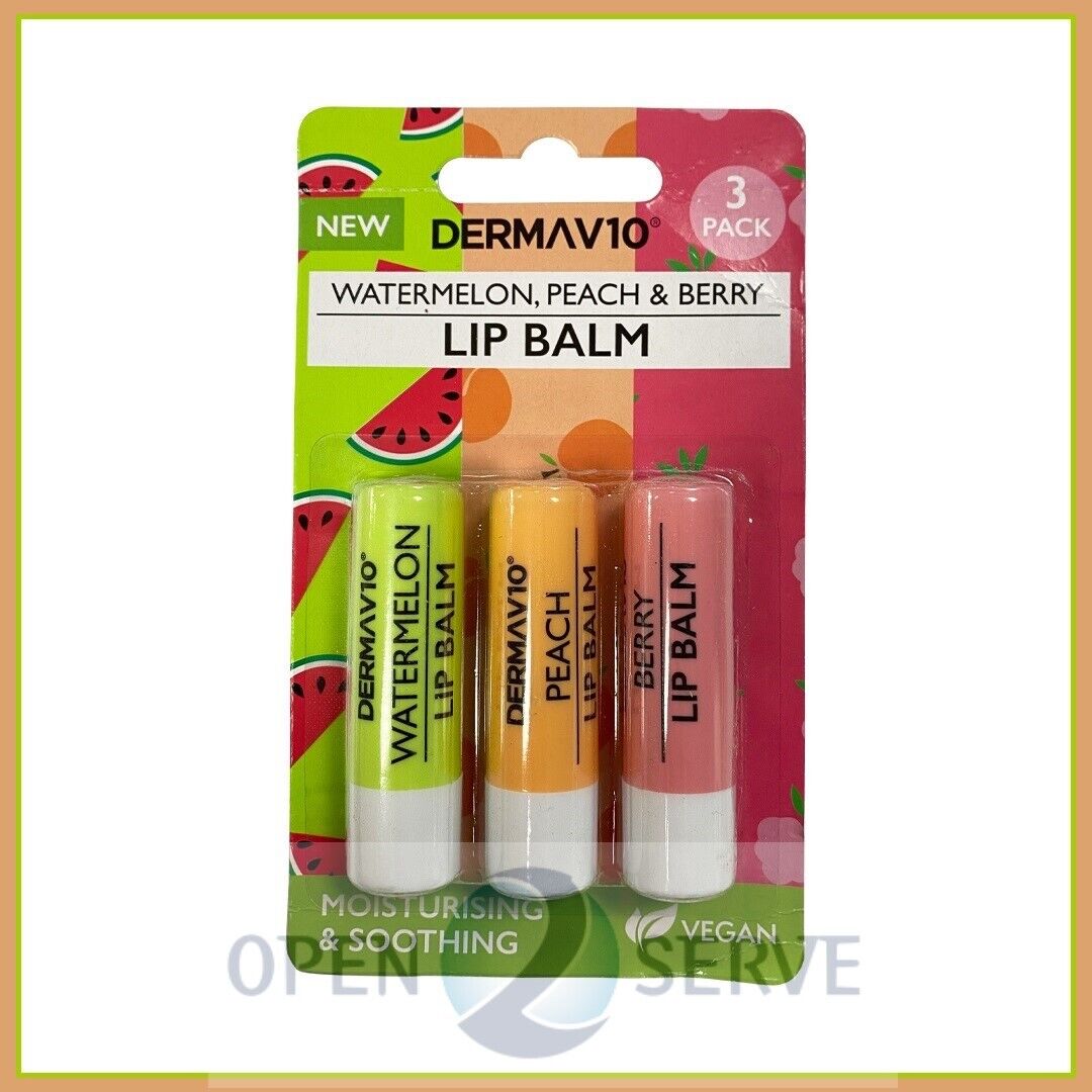 1X 3PK Derma V10 Lip Balm Watermelon Peach and Berry Lip Balm - NEW UK