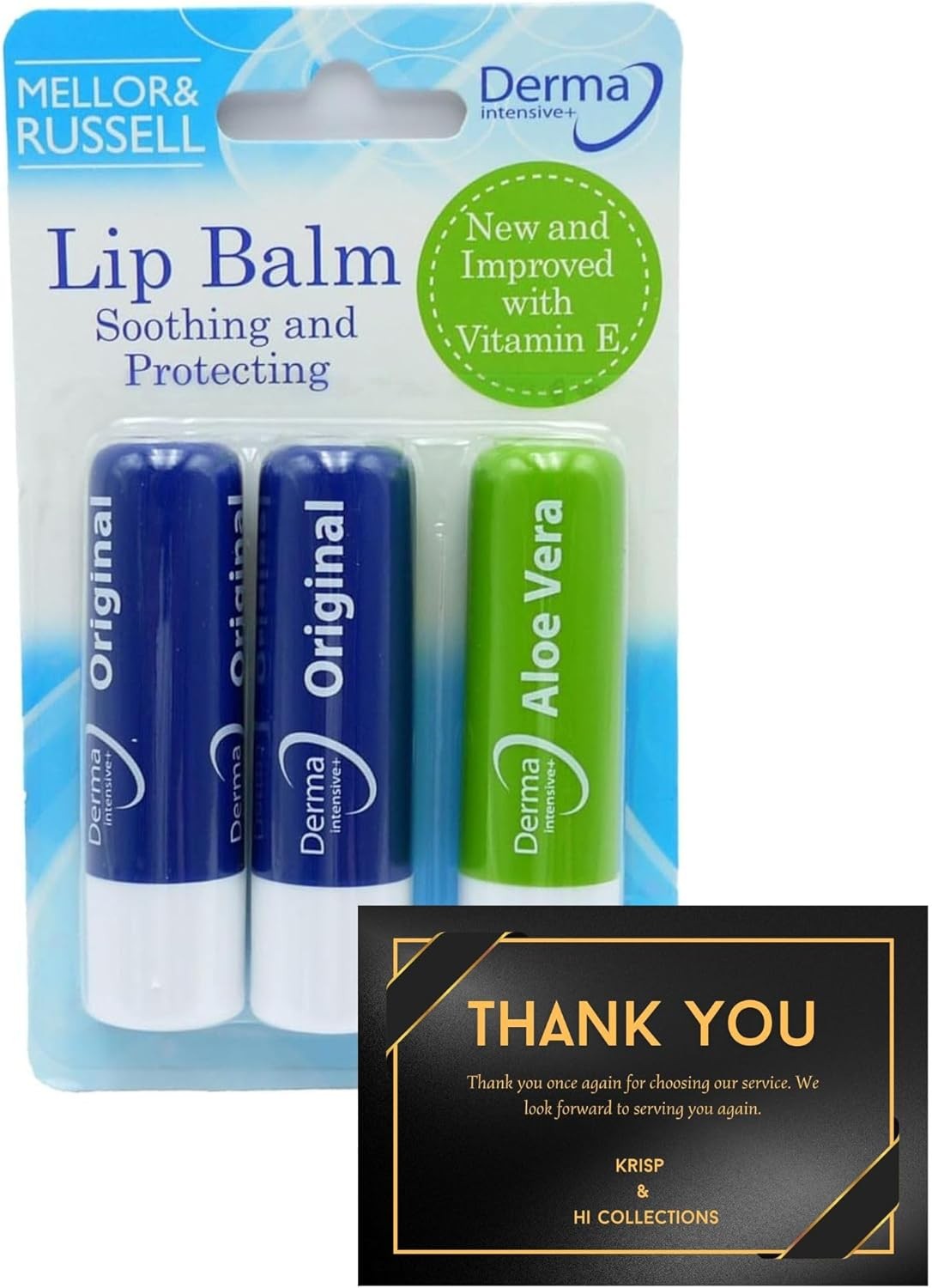 Derma Intensive Lip Balm 3 Pack - Soothing & Protecting with Vitamin E, Aloe Ve