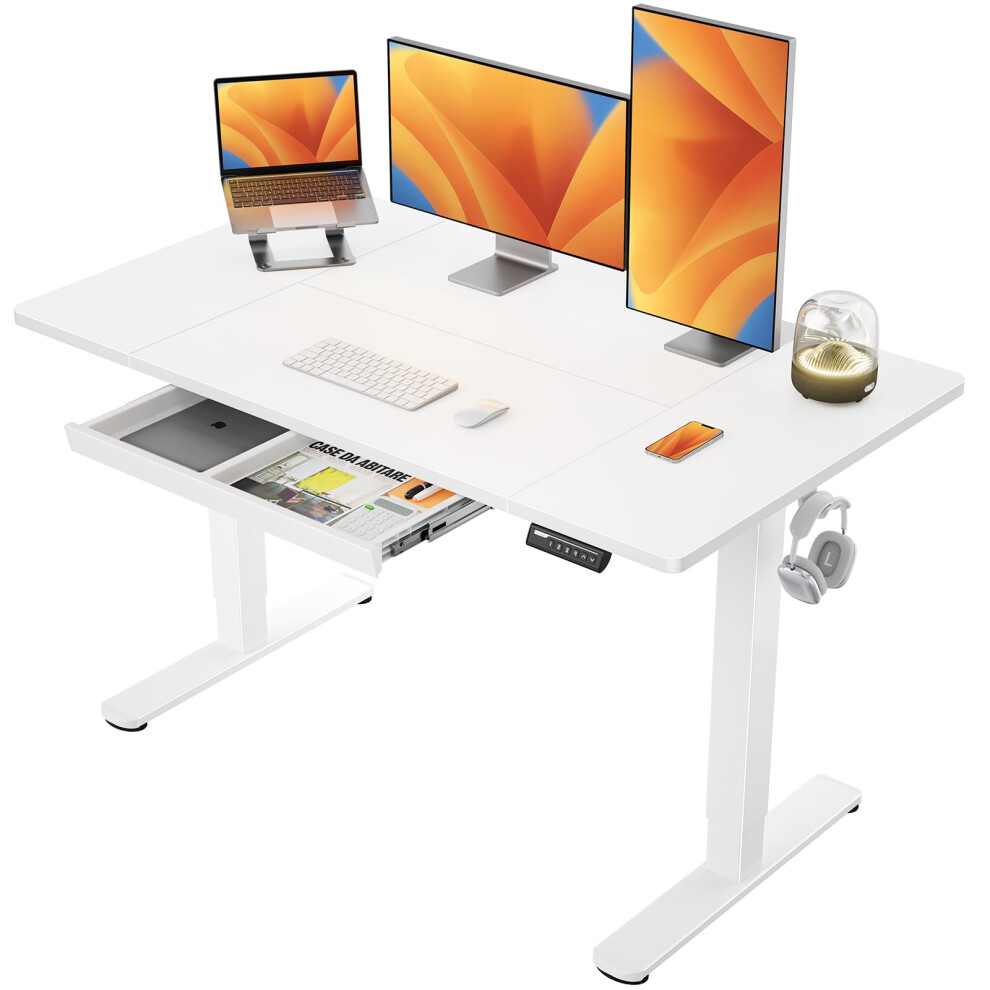 DLONGONE Electric Standing Desk,120 x 80 cm Height Adjustable Standing Desk with 2 Drawers, Power Outlet and USB Port, Sit Stand Table with Memory Smart Pannel, Stand Up Desk for Home Office, White