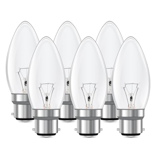B22 Bayonet Clear Candle Light Bulb, C35 Candle Bulb, Dimmable Warm White 2700K, 400 Lumen, AC 230V, Bayonet Light Bulb, BC Candle Bulb, for Chandeliers, Desk Lamp, Ceiling Fixture, 6 Pack
