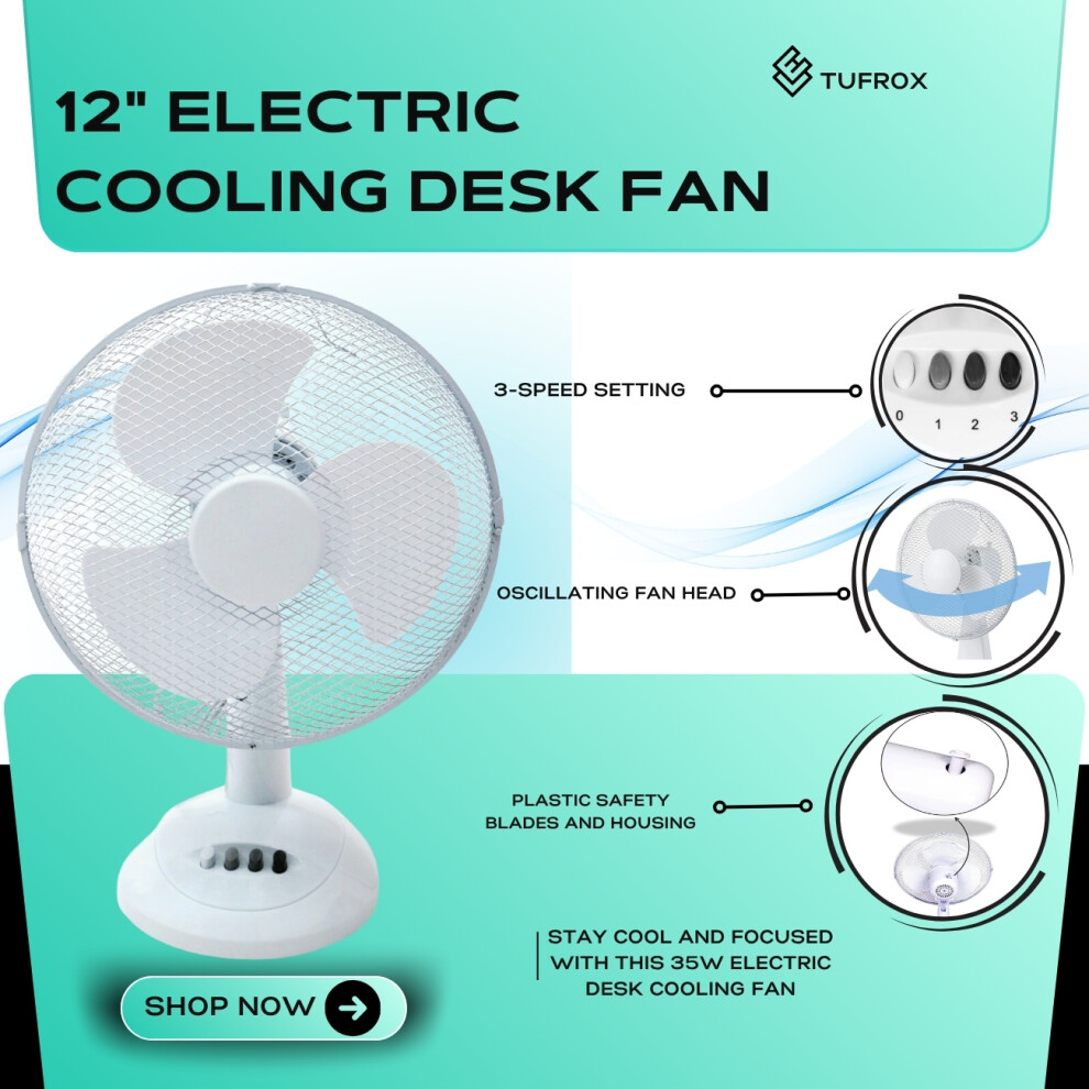 12" Inch Portable Desk Fan Lightweight 3 Speeds Wide-Angled Oscillation Powerful Airflow Quiet Operation Perfect for Home, Bedroom or Office 12 inch