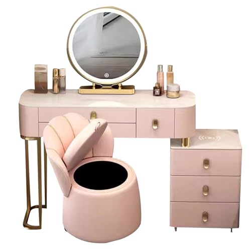 Vanity Mirror with Lights 3 Colors Makeup Desk Vanity Set with USB Charging Speakers Wireless Charger Storage Stool Feet Bedroom