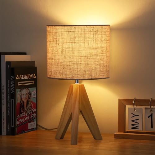 EDISHINE 36cm Wood Bedside Table Lamp, Tripod Desk Lamp with Beige Linen Lampsh