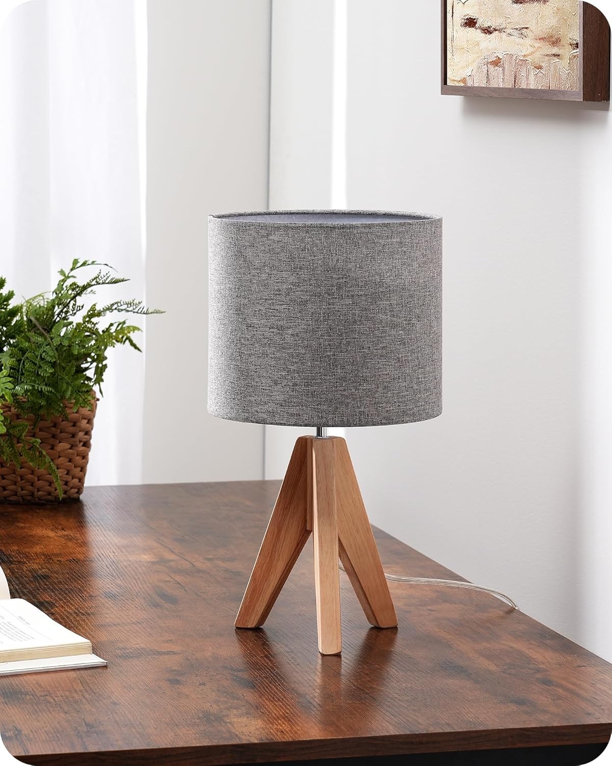 EDISHINE 36cm Wood Bedside Table Lamp, Tripod Desk Lamp with Grey Linen Lampsha