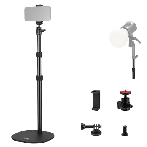 NEEWER Projector Floor Stand with Heavy Base, 16"-35"/40-90cm Desk Tripod with Phone Holder & Action Camera Mount, Ball Head Webcam Video Projector Mount Compatible with XGIMI Nebula MEVO, DS006