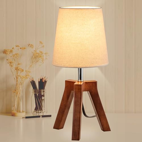 EDISHINE 36cm Wood Bedside Table Lamp, Tripod Desk Lamp with Beige Linen Lampshade, On-Off Switch, Desk Lamps for Reading, Bedroom, Living Room, Study, Office, E27 Base