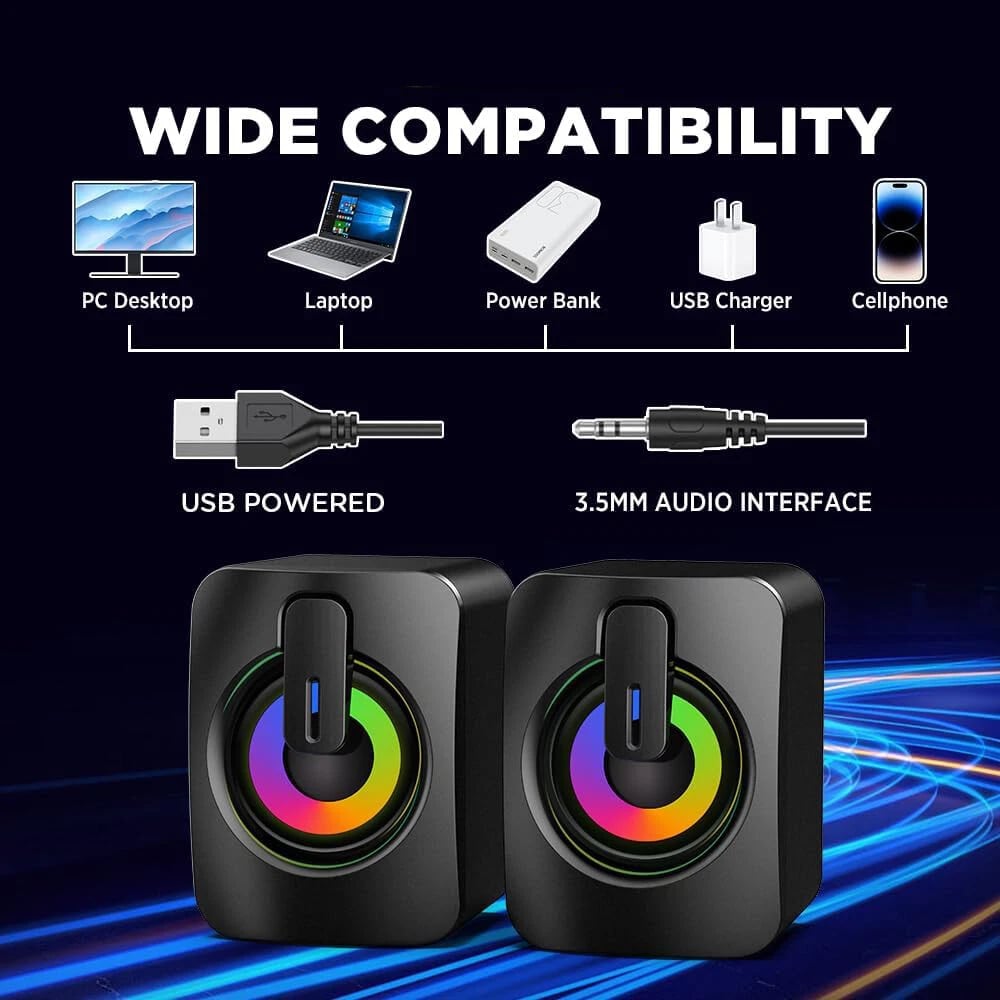 PC Speakers 2.0 USB Powered Stereo Volume Control with LED Light Mini Portable Gaming Speakers 3.5mm for PC Cellphone Tablets Desktop Laptop