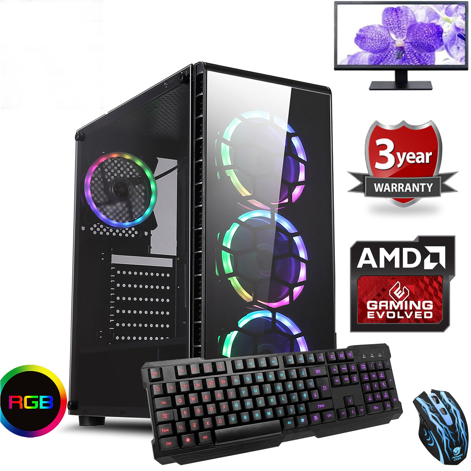 OCHW Seven Rgb Ultra Fast Gaming PC Desktop Computer AMD Ryzen 3 3200G 4.0Ghz 8 Threads ATI Radeon HD Graphics USB 3.0 480GB SSD 8GB DDR4 Wifi 24" Screen 4 in one Bundle Windows 11 Pro