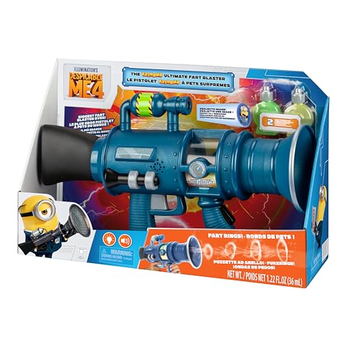 Minions Despicable Me 4 The Ultimate Fart Blaster; Blasts out REAL Rings of fog; Plays 15 Different Sounds Lights Up and Emits Smells; It Includes 2