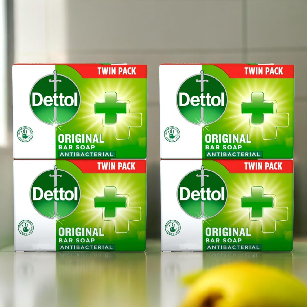 Dettol Soap Original Antibacterial Bar - 4 Twin Pack, 8 x 100g Antibacterial Hand & Body Soap Bar – Disinfects and Kills 99.99% of Germs, Ideal for Handwashing and Cleansing
