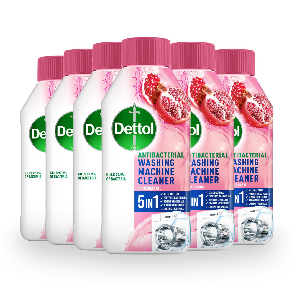 Dettol Pomegranate Washing Machine Cleaner, Antibacterial Liquid, Eliminates Bacteria, Odour, Limescale, Dirt, Pack of 6 x 250 ml, Fresh Scent, Deep