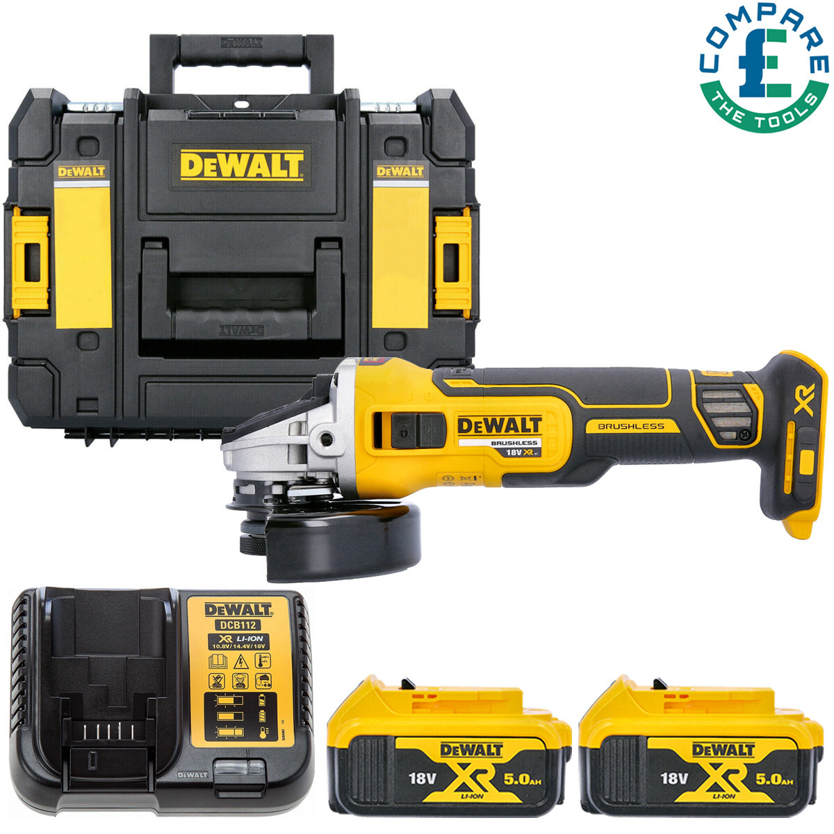 DeWalt DCG405 18V XR BL 125mm Angle Grinder + 2 x 5Ah Batteries, Charger & Case