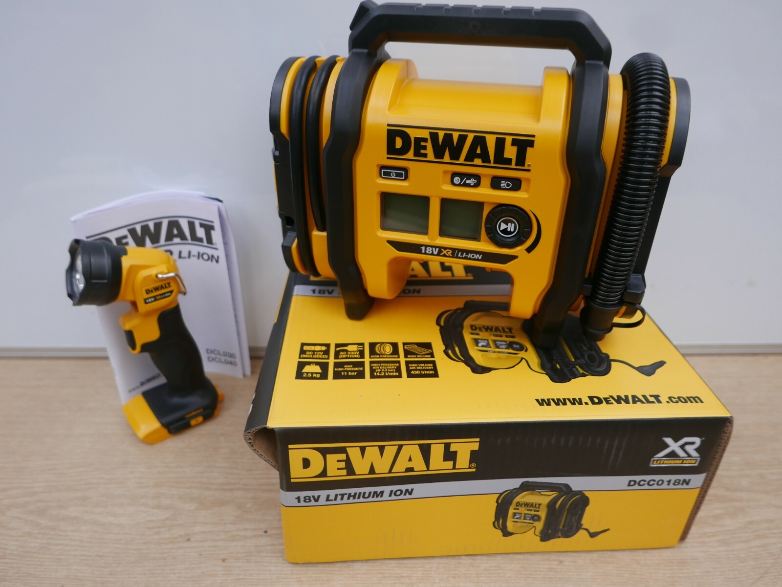 DeWalt DCC018 18V XR Cordless Tyre Inflator + DCL040 18V Worklight Torch