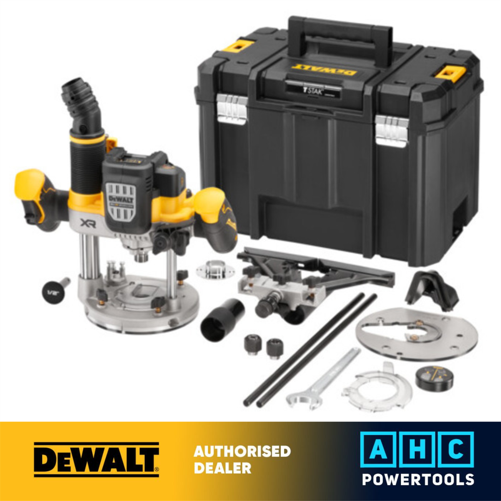 DEWALT D26204K-GB Premium Plunge & Fixed Base Router Combination, 900 W, 240 V, Yellow/Black, 1/4 Inch (8 mm), Set of 9 Pieces