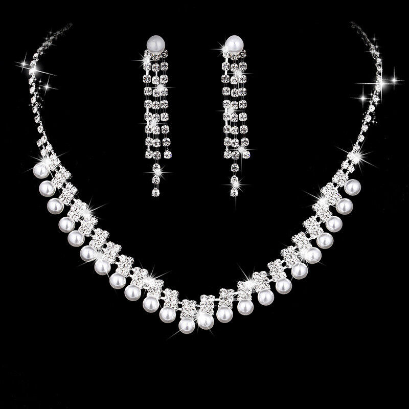 Pearl&Clear Diamante silver colour Necklace&earrings set wedding prom new set 1