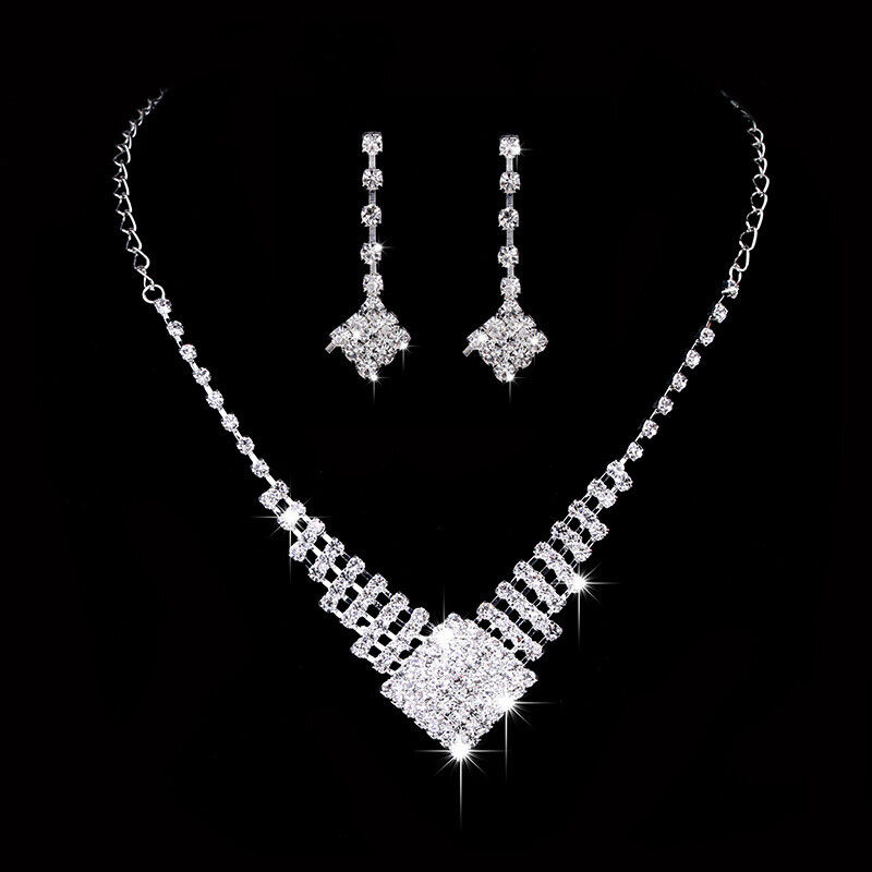 Sparkling Square Crystal Diamante Silver Necklace Earrings Set Costume Jewellery