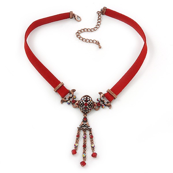 Victorian Red Suede Style Diamante Choker Necklace In Bronze Tone Metal - 34cm