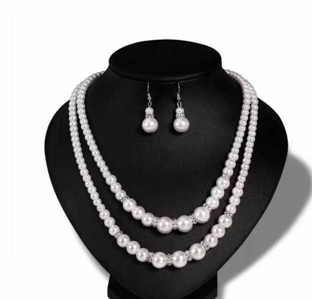 2 Layers Large White Pearls Diamante Necklace And Earrings Set Costume Jewellery