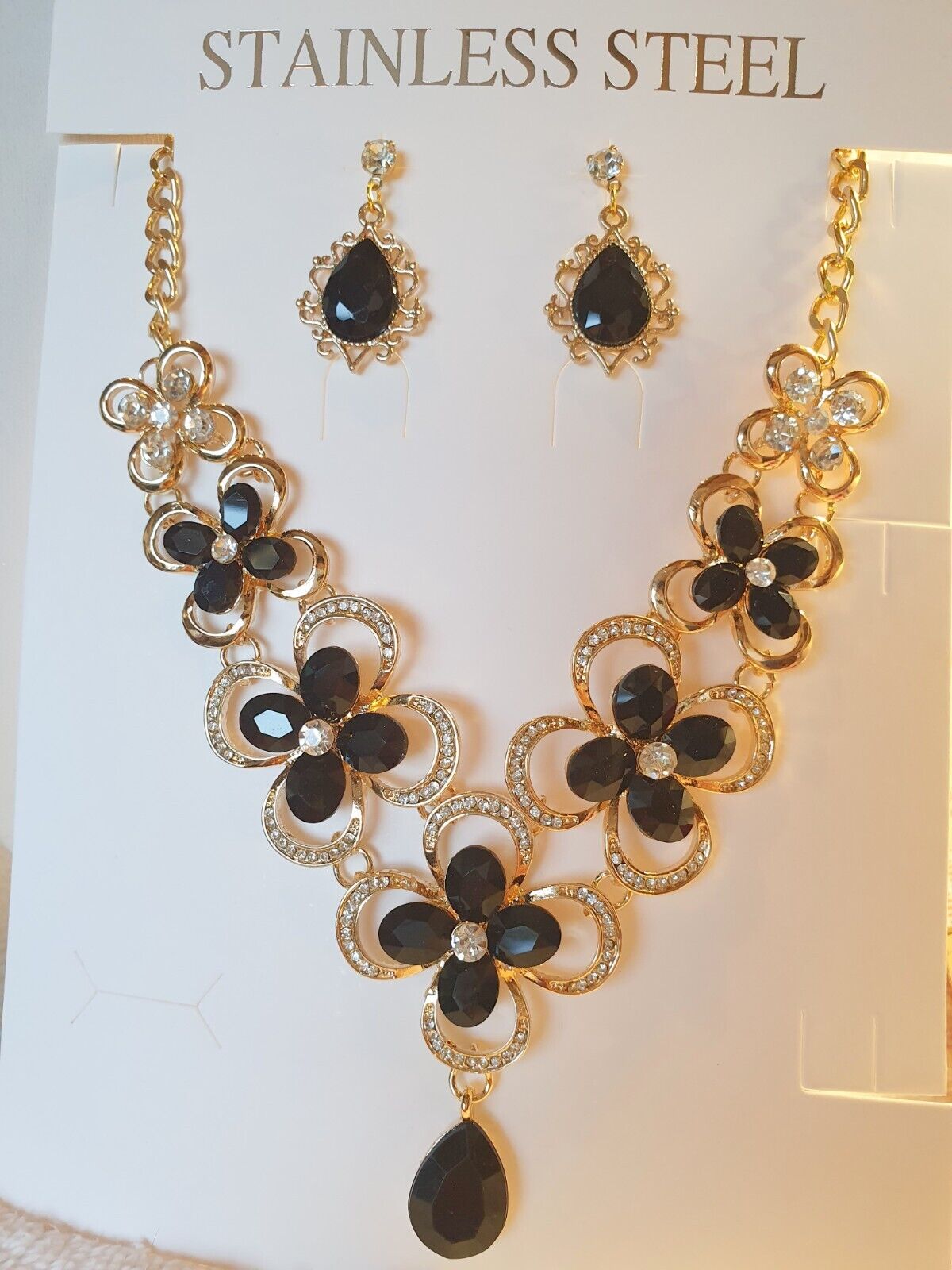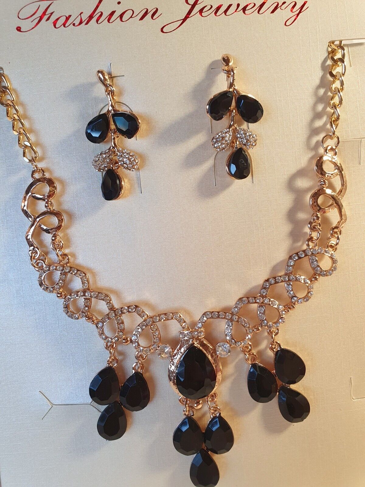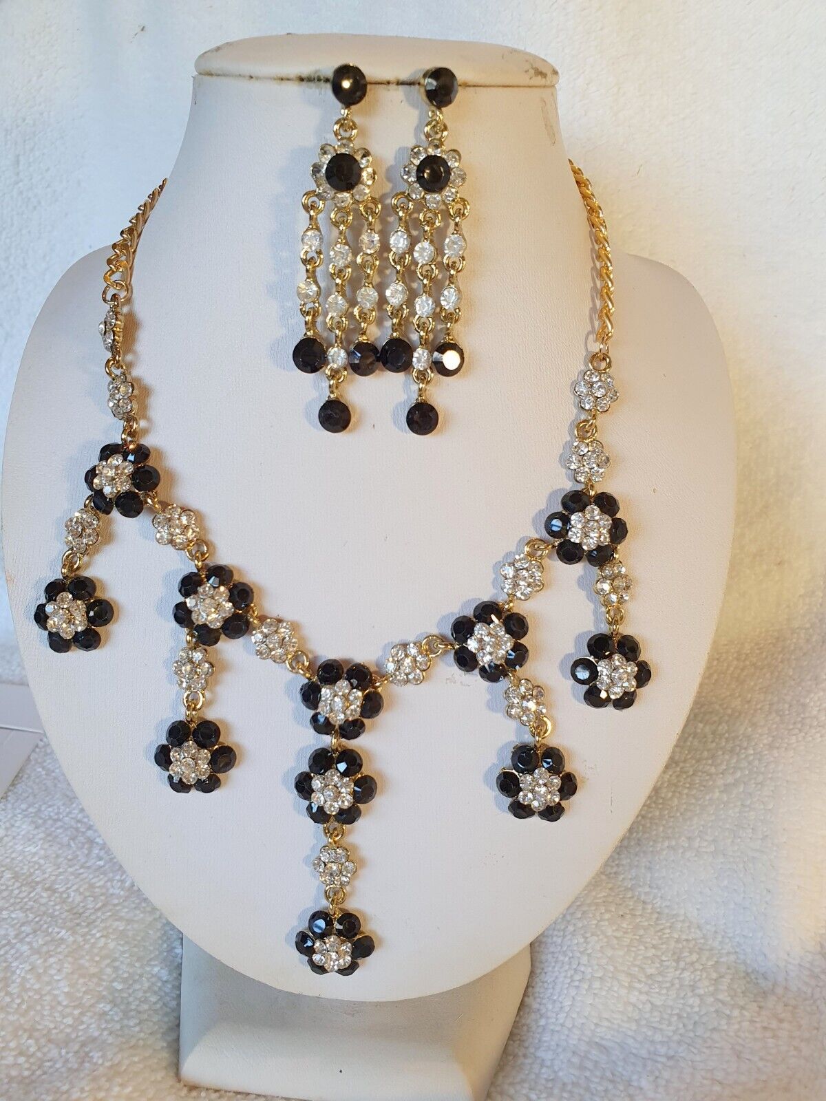 Black & Silver colour Diamante Necklace & earrings set Silver colour chain