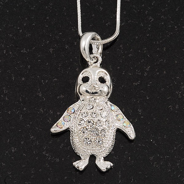 Diamante 'Penguin' Pendant Necklace In Rhodium Plated Metal - 40cm Length & 4cm