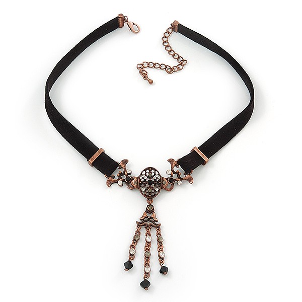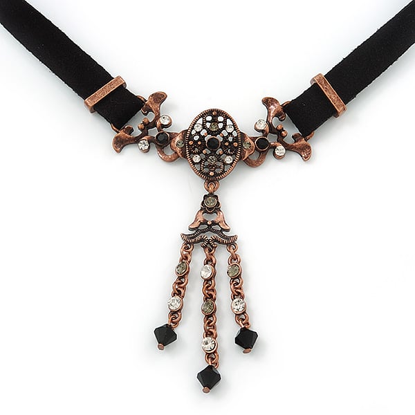 Victorian Black Suede Style Diamante Choker Necklace In Bronze Tone Metal -