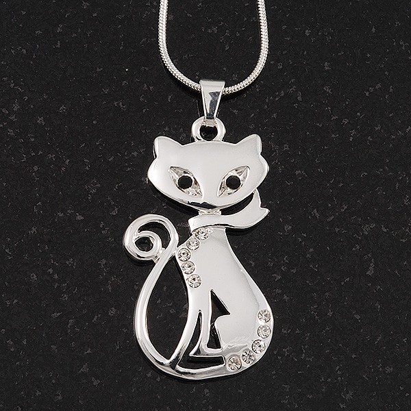 Cute Clear Diamante 'Cat' Pendant Necklace In Silver Plating - 40cm Length