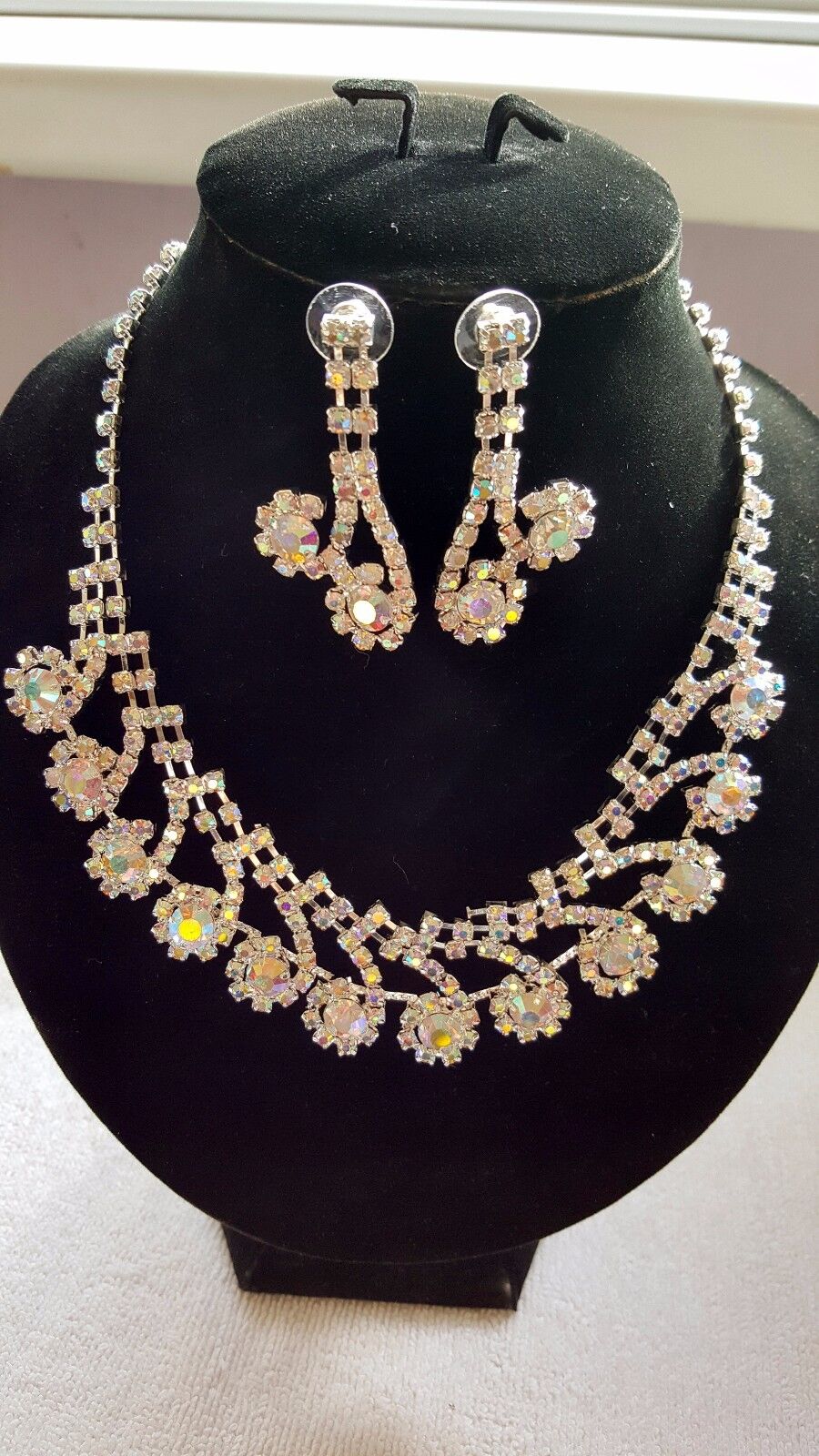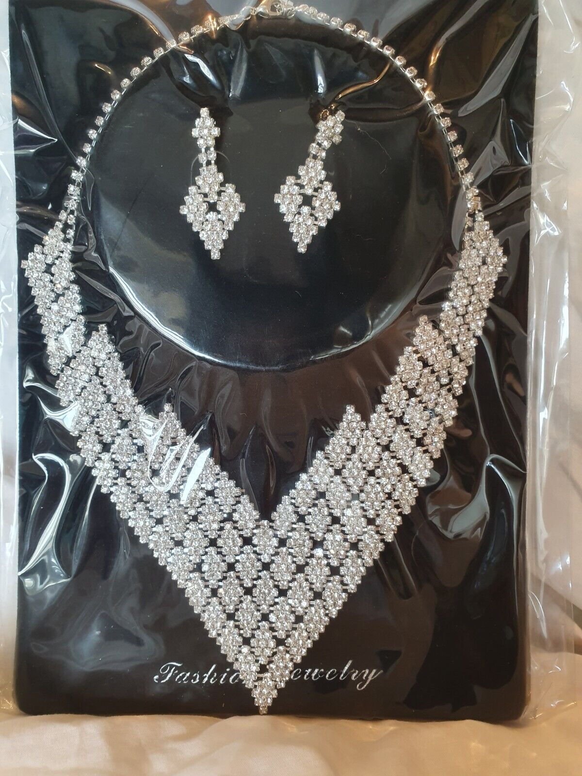Crystal Diamante Collar Silver Necklace And Earrings Set Costume Jewellery
