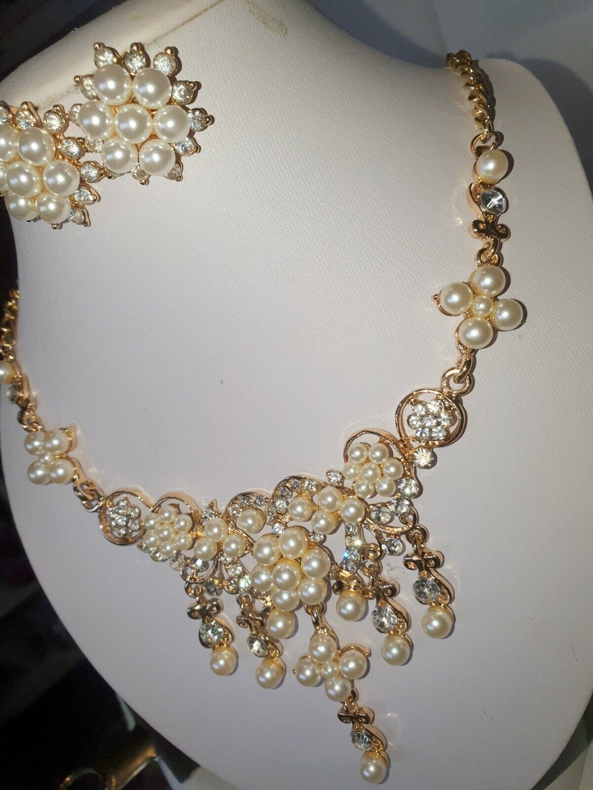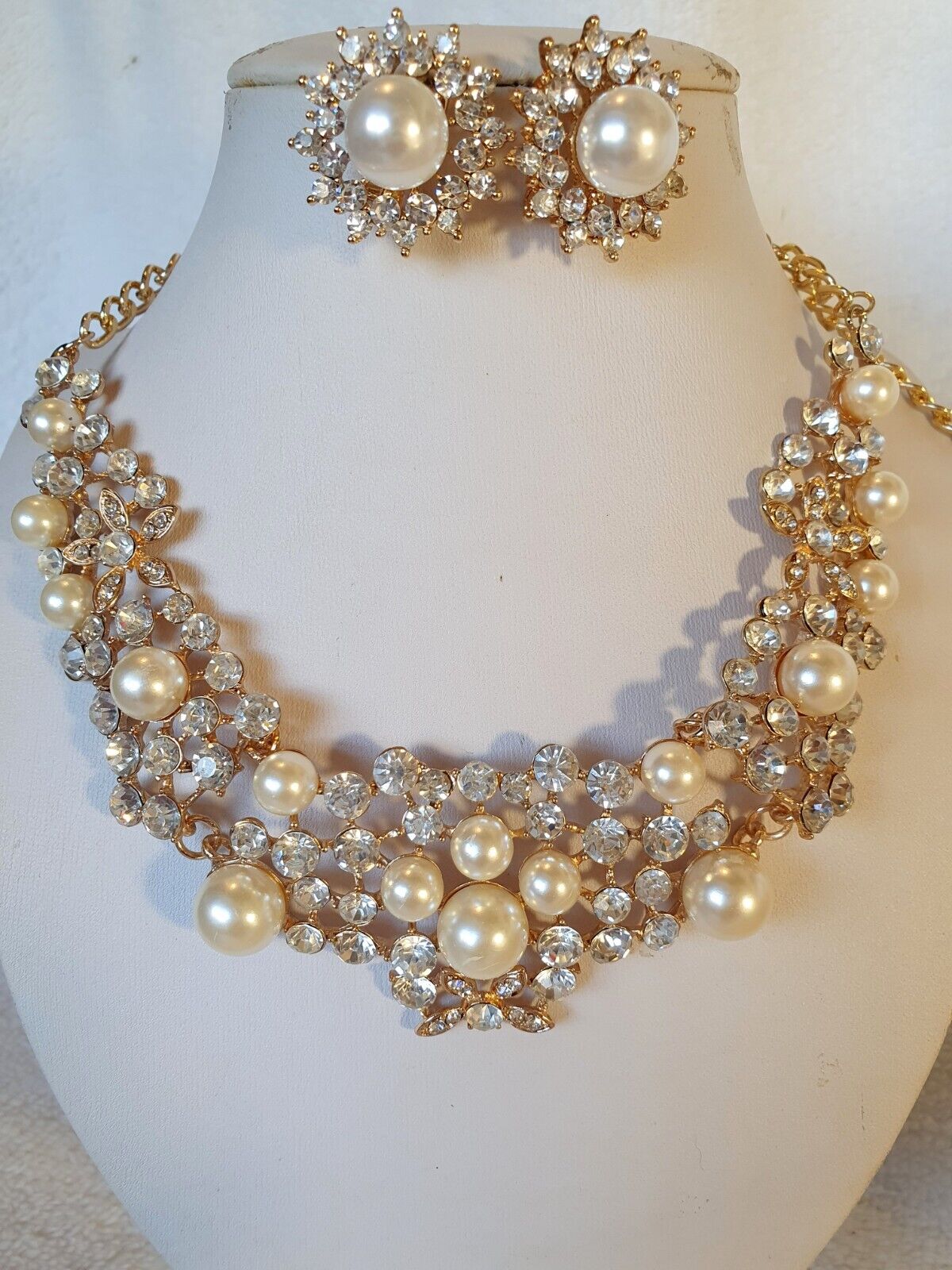 White Pearls Diamante Flowers Gold Necklace Earrings Set Costume Jewellery