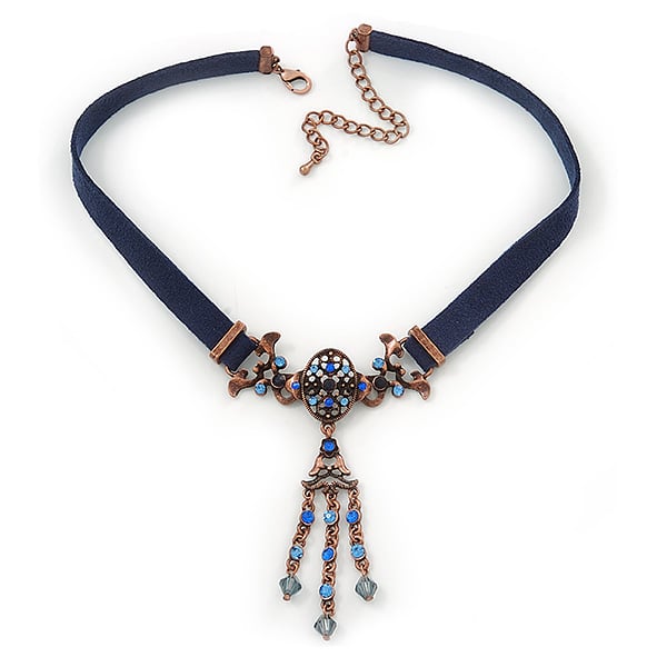 Victorian Dark Blue Suede Style Diamante Choker Necklace In Bronze Tone Metal -
