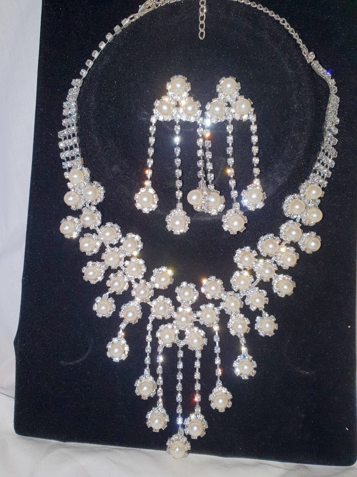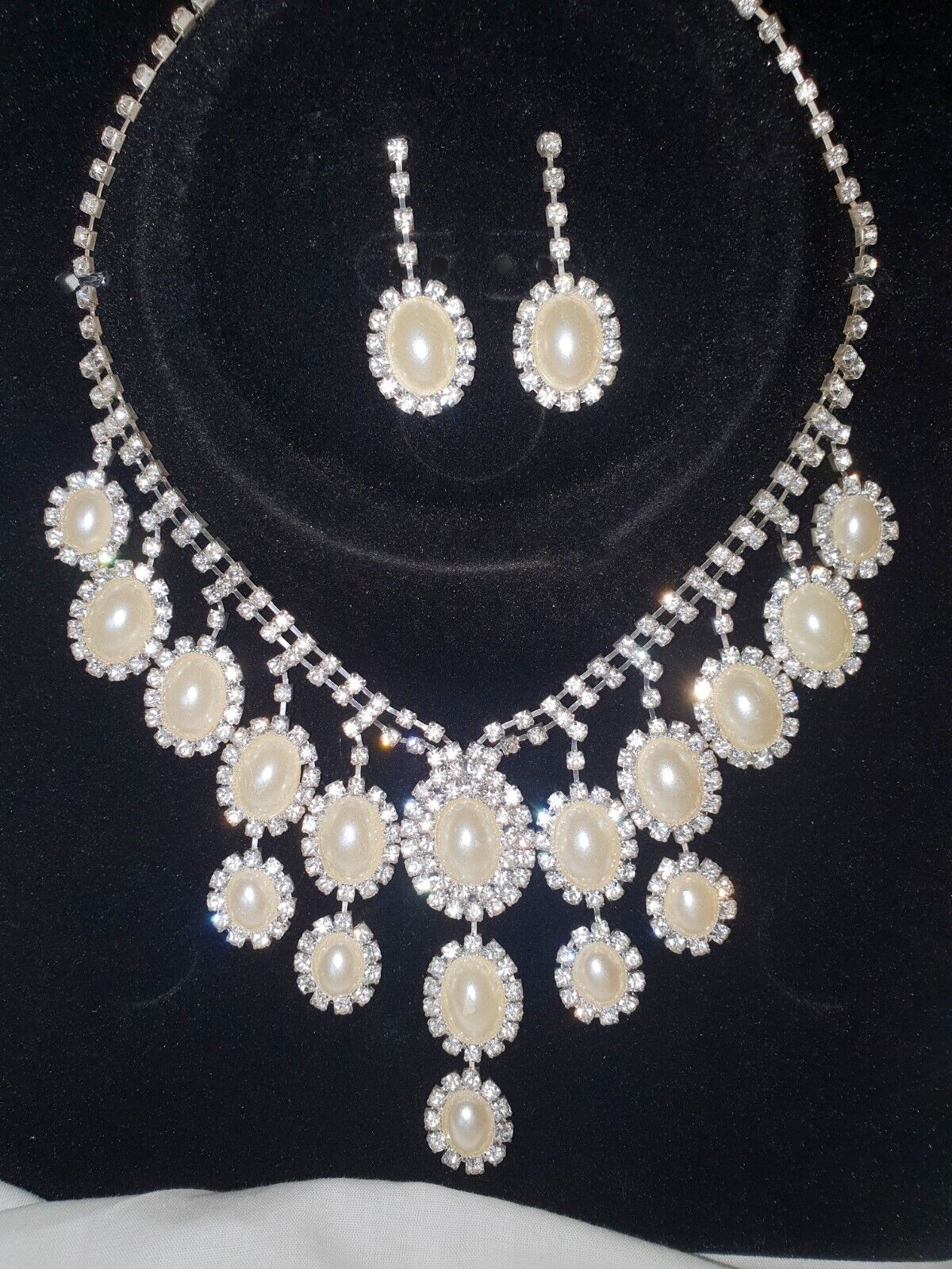 White Pearls Crystal Diamante Silver Necklace Earrings Set Costume Jewellery
