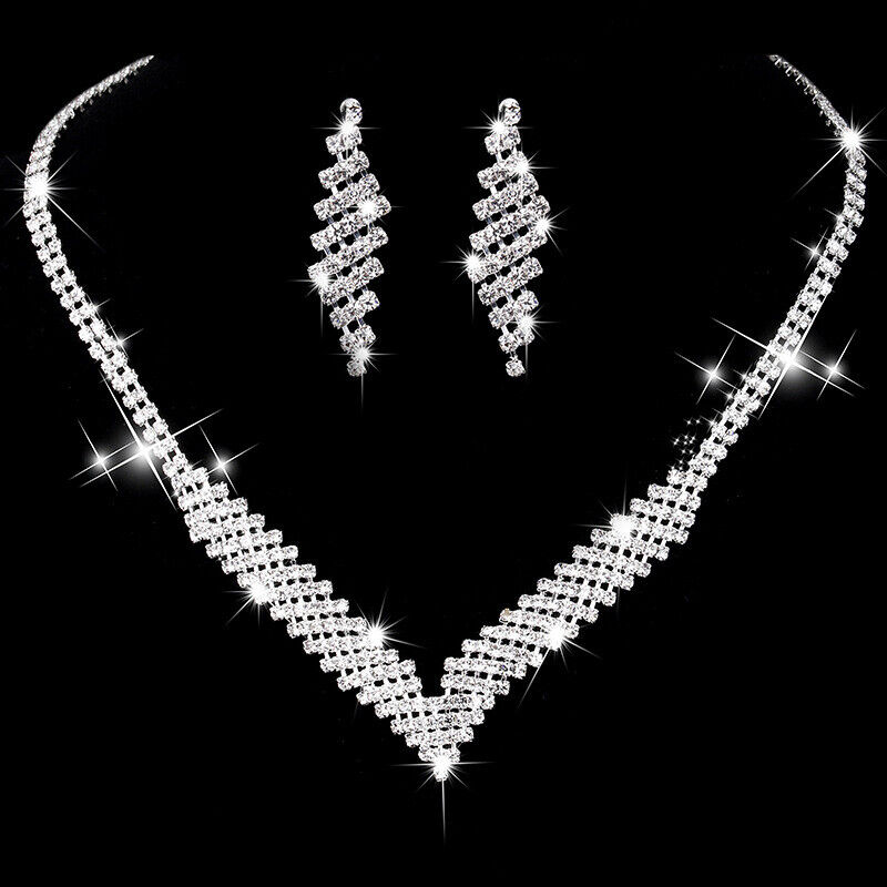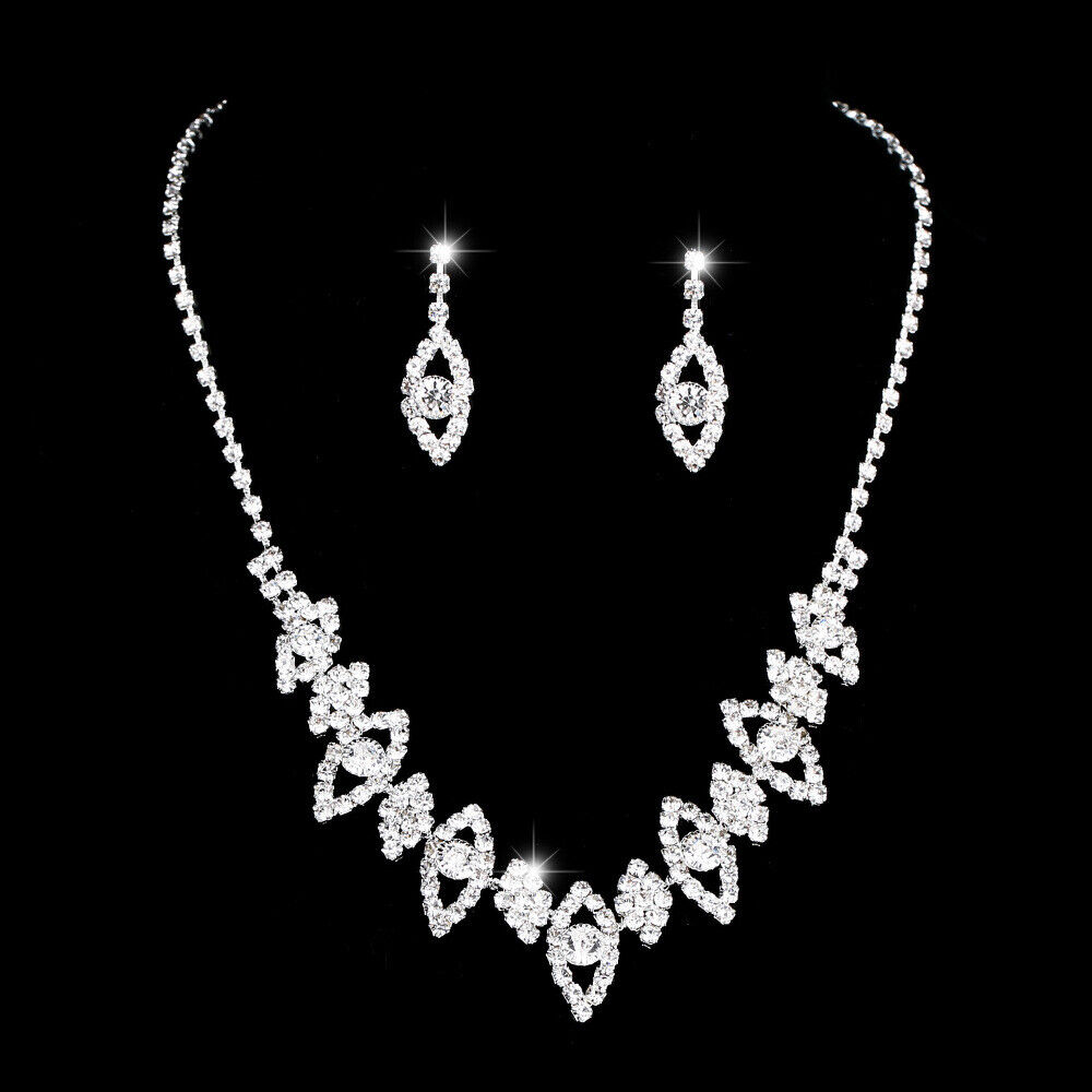 Crystal Diamante Silver Collar Necklace Bracelet Earrings Set Costume Jewellery