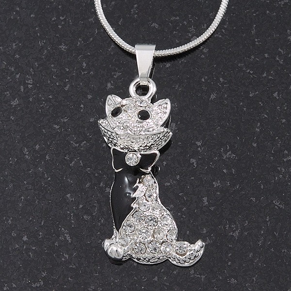 Rhodium Plated Diamante 'Cat' Pendant Necklace - 40cm Length & 4cm Extension
