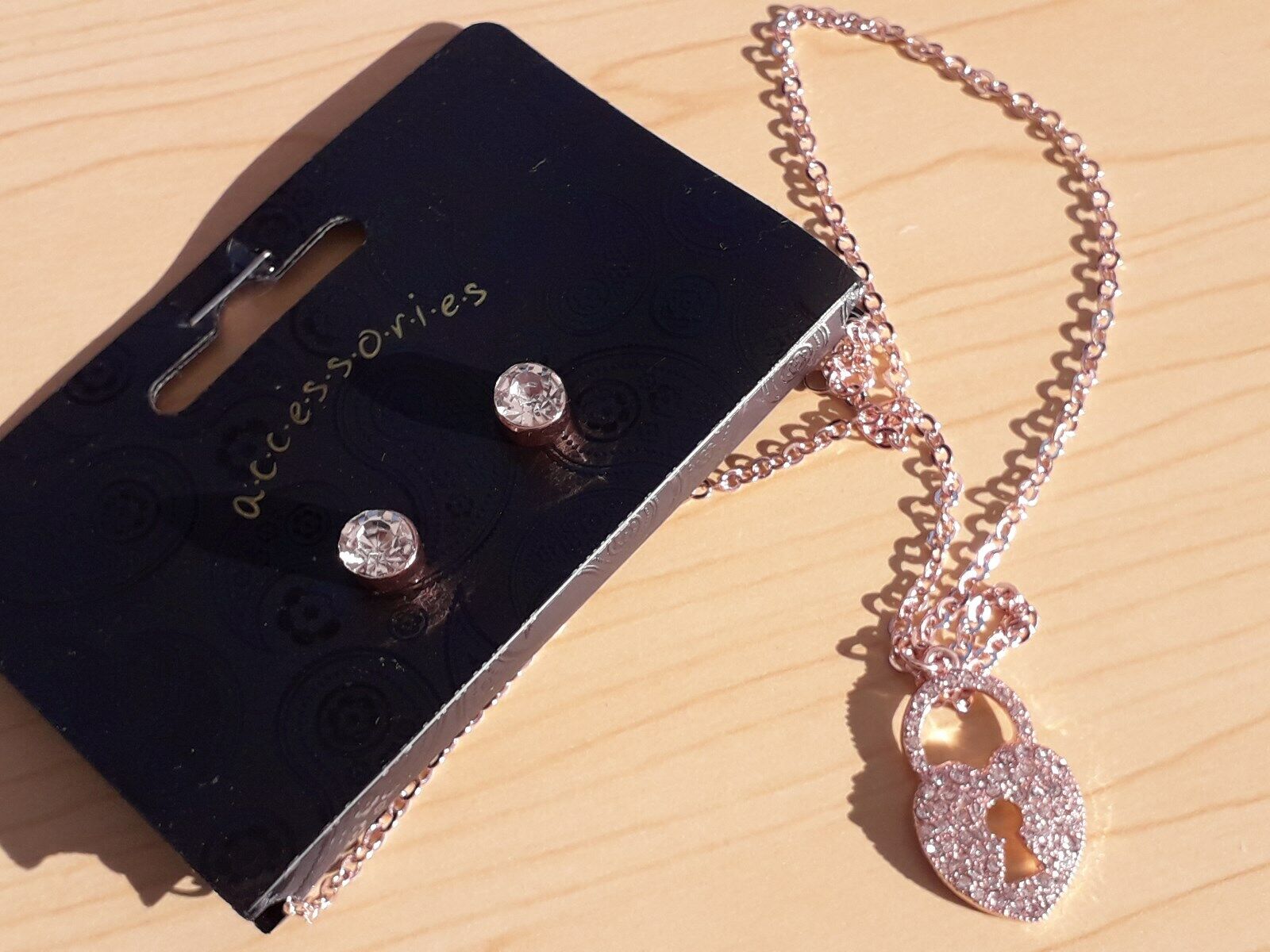 BNWT Accessories Gold Tone Chain/Diamante Padlock Design Necklace/Stud Earrings