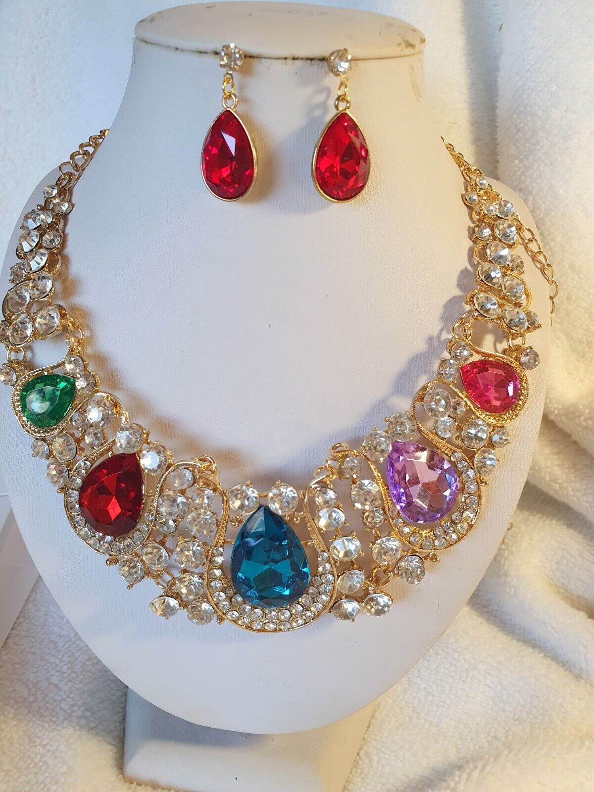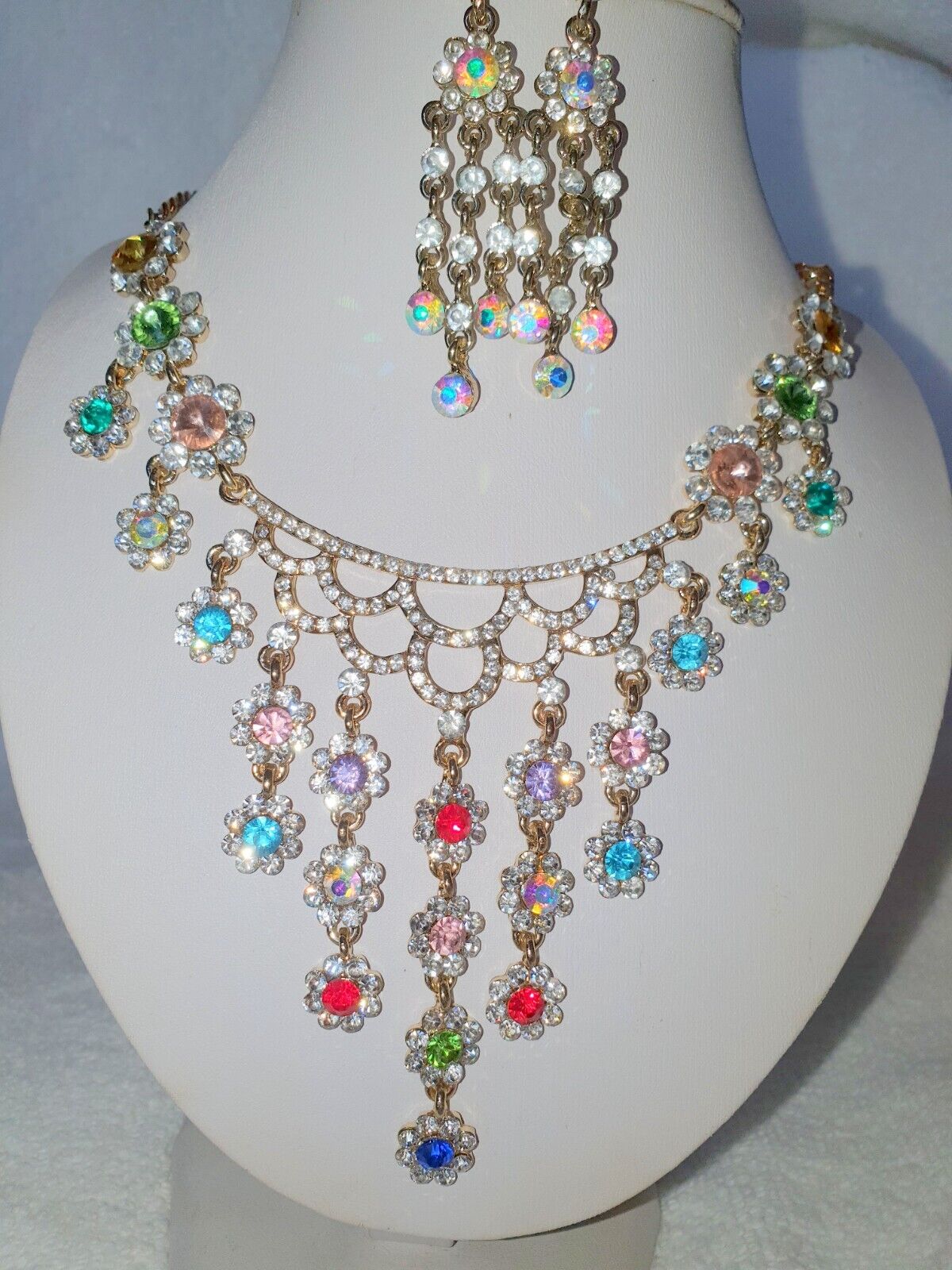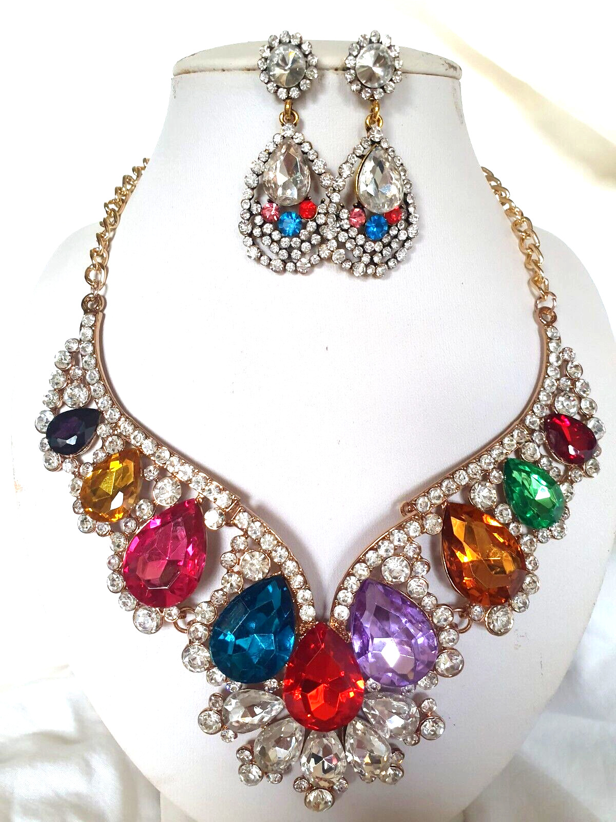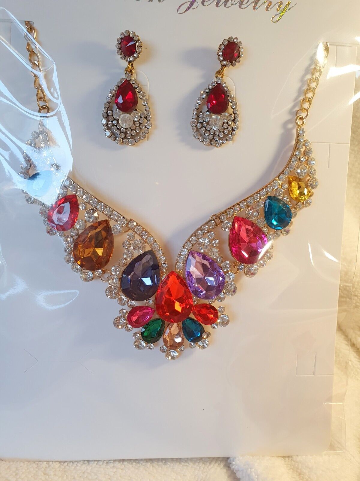 mixed colour Diamante crystal Necklace & earrings set wedding prom new set