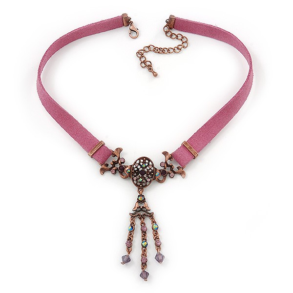 Victorian Lavender Suede Style Diamante Choker Necklace In Bronze Metal - 34cm