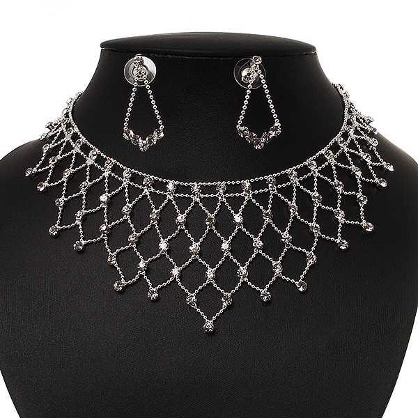 Bridal Clear Diamante Net Style Necklace & Earrings Set In Silver Plating